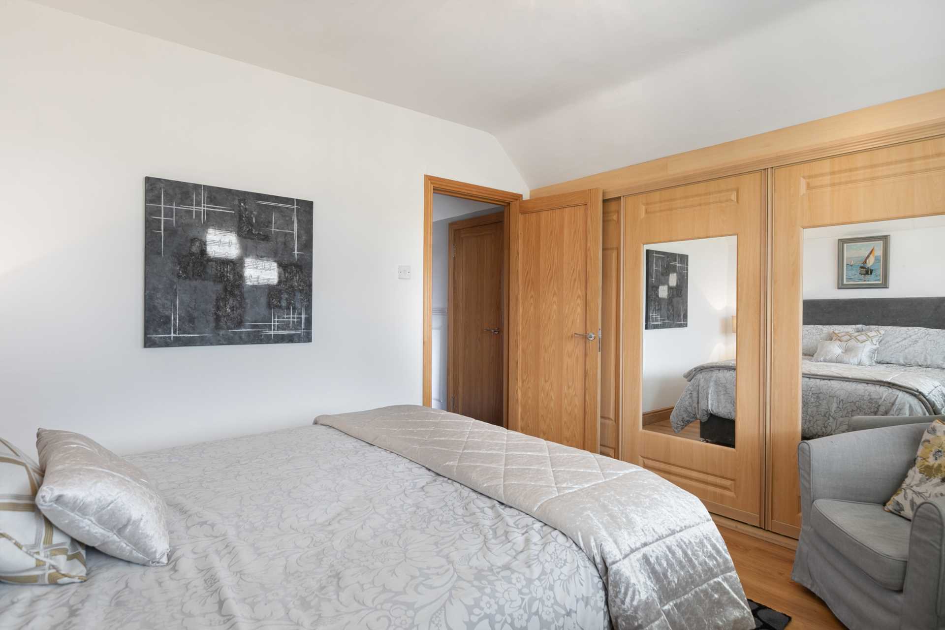 Triple-glazed window. Fitted wardrobe. Door to eaves storage. Blinds. Curtain rod. Wood laminate flooring. Light fitting.