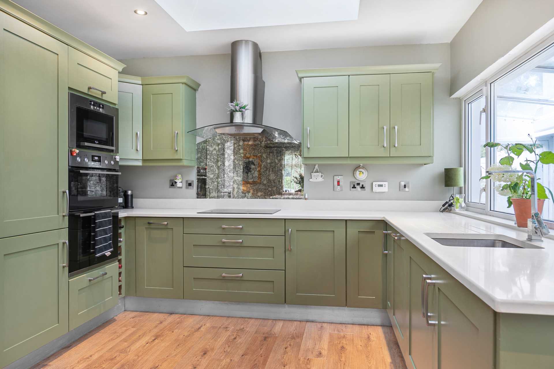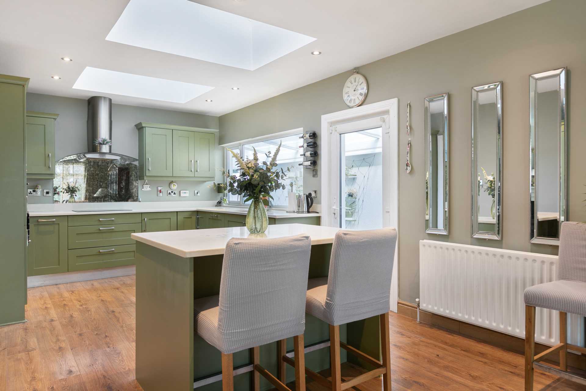 Large kitchen window. Two skylights. Door to back garden via covered side passage with toughened glass roof. Fitted kitchen painted in fern green. White stone counter-tops. Matching island. Plenty of press space including cutlery drawer, large saucepan drawers, corner presses, wine rack, Integrated fridge-freezer. Integrated dishwasher. Fitted wInduction hob with stainless steel hood. Eye-level double oven. Fitted microwave. Washing machine. New appliances fitted in 2022.