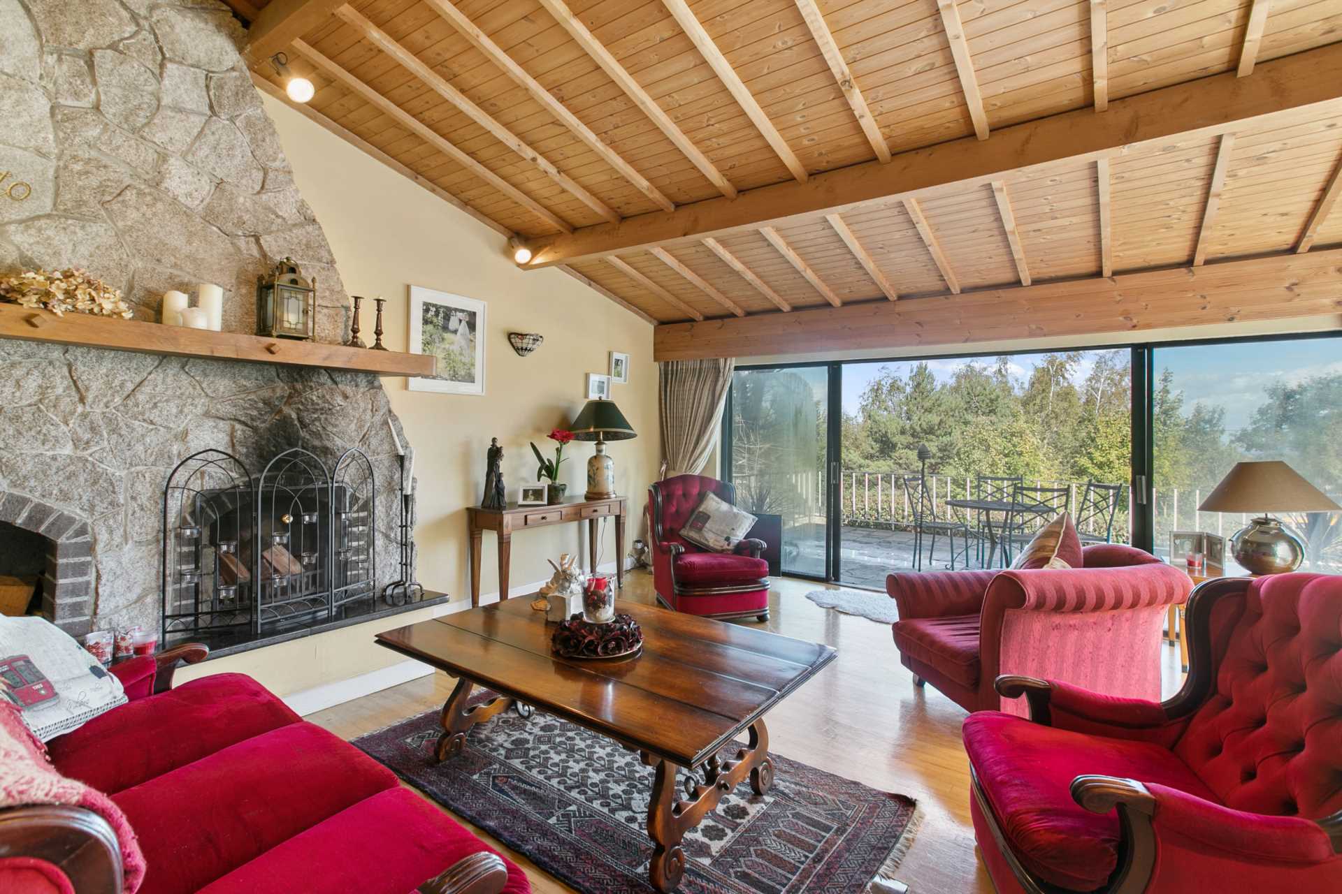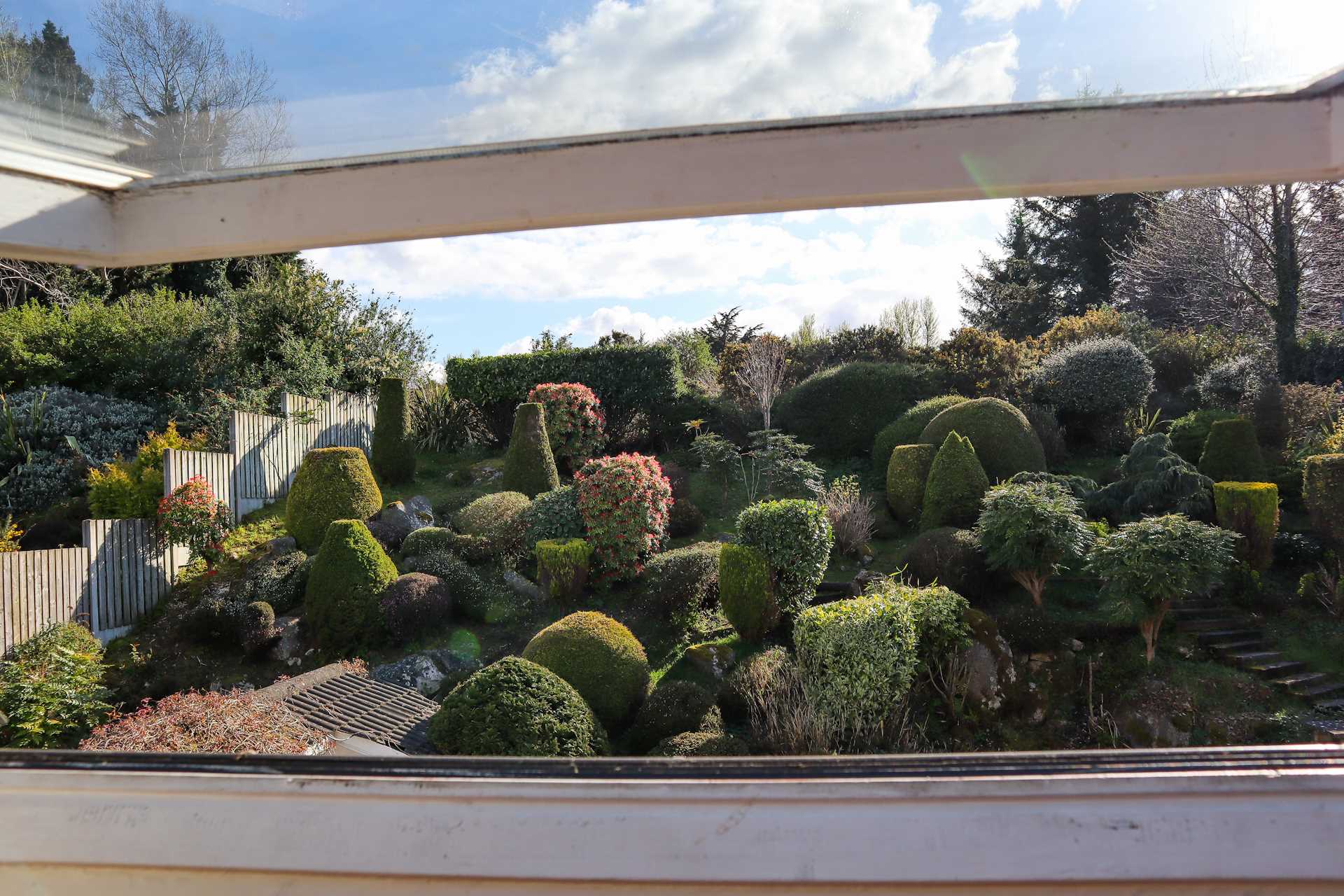 A large triple garage, 10m deep, extends under the terrace and front room. In front of this is a front lawn 8m x 10m which will be finished and set in grass. There is a 4.5m wide driveway running along the side of the property, with vehicular doors leading to the back sun patio. At the back of the patio is a garden pond set into the sloped back garden. From the top of the garden there is a fabulous view, which could be a great backdrop for a garden studio. Behind this, to the rear of this property, is agricultural land on the lower slopes of Three Rock Mountain.