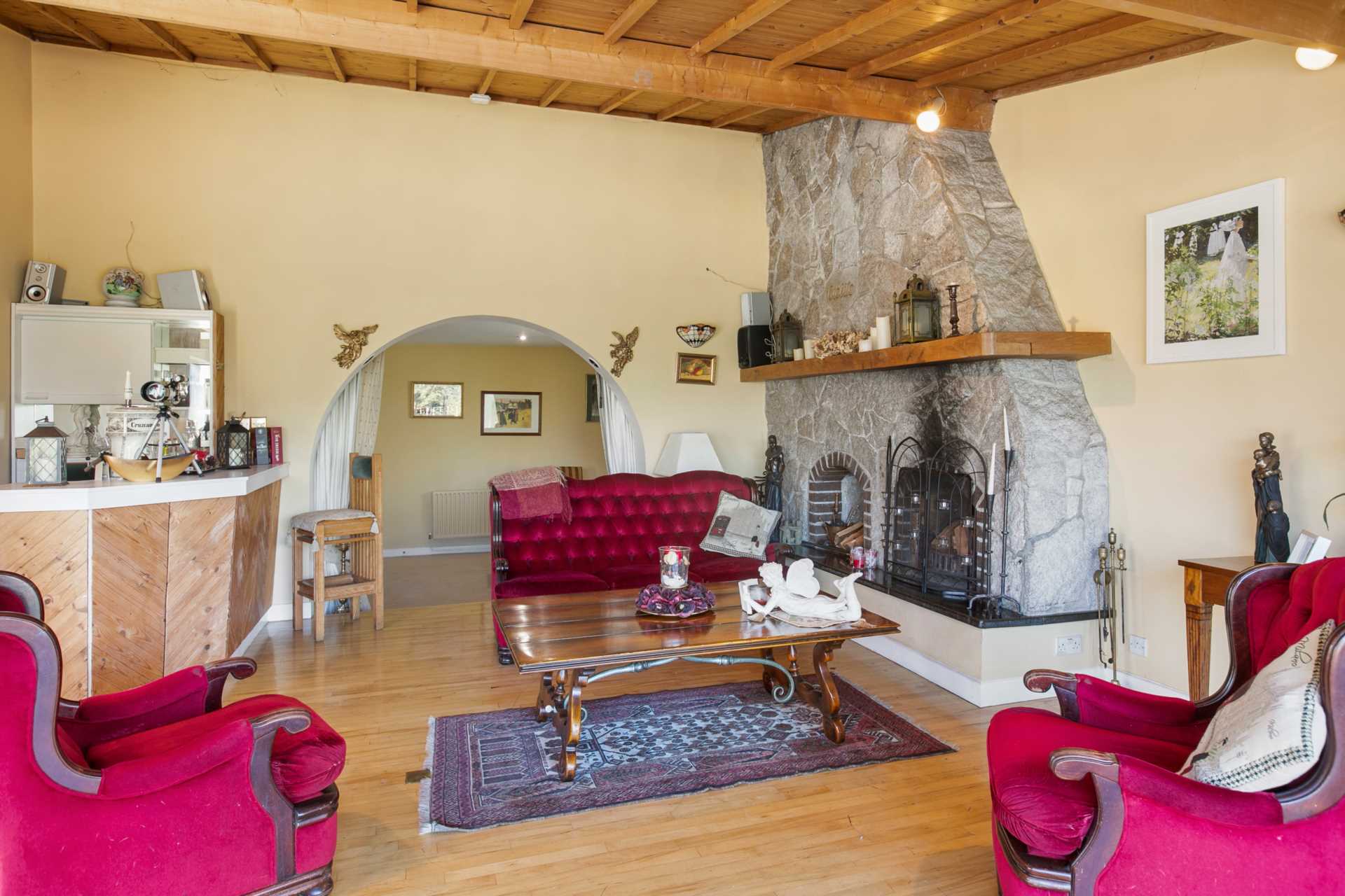 Very spacious room perfect for entertaining. Living area with patio doors to large terrace. Granite fireplace with log recess and polished black granite hearth. Corner bar. Solid wood flooring. Large window. Lofted ceiling. Dining area with fitted dresser, large window, carpet.