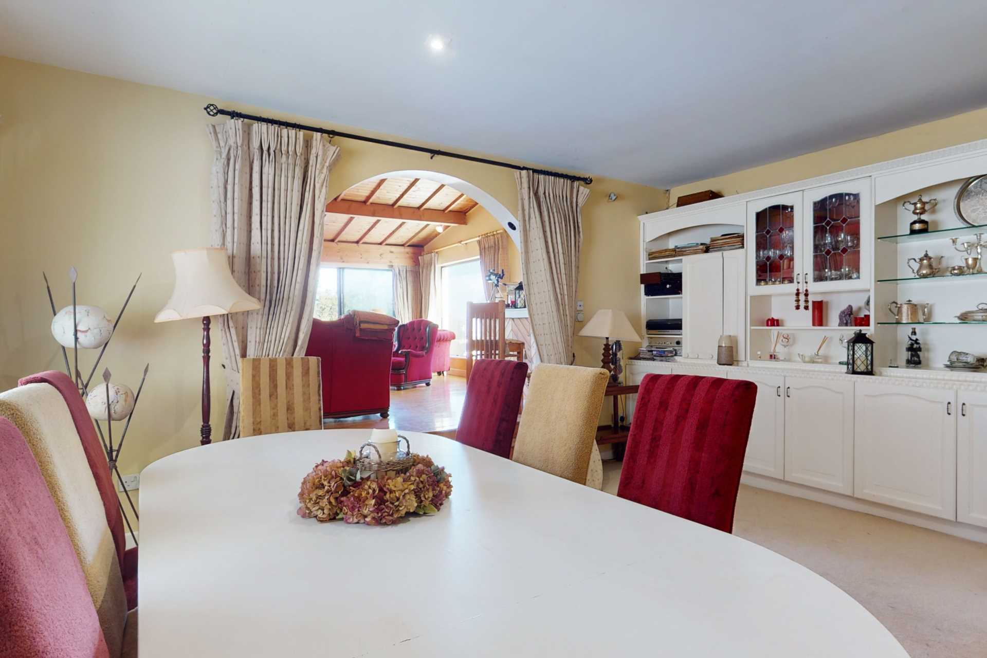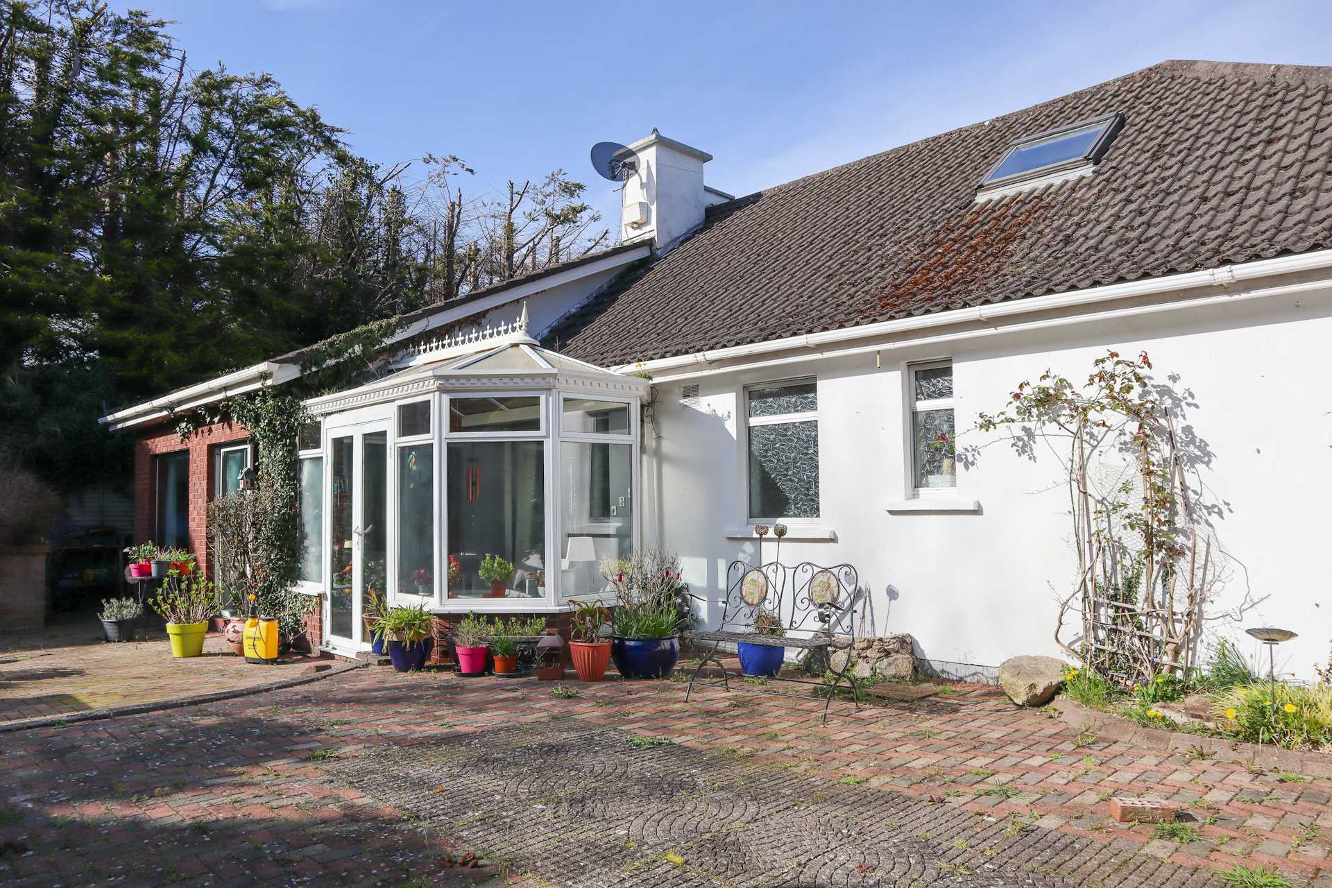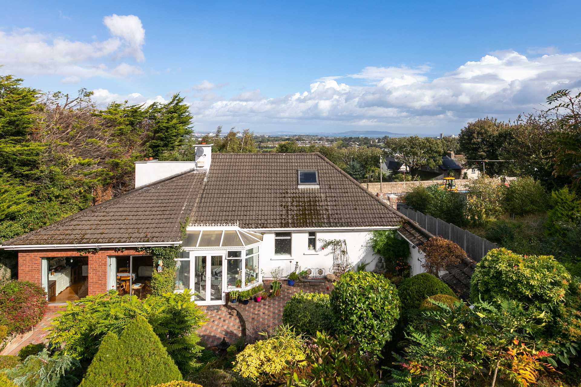 Cielito (D18 P2X2) is a generous bungalow in an elevated setting nestled into the hillside, with views across the Southside of Dublin and Dublin Bay to Howth Head. It is securely situated behind new granite walls and 4m wide electric gates. This is an ideal property for entertaining with its interconnecting reception rooms opening to a large terrace. To the rear the spacious kitchen/breakfast room has a window and patio doors opening to a bright and beautiful SW facing sun patio. A second set of patio doors opens to a wonderfully bright conservatory getting all day sunshine. There is a quiet and cosy back lounge with a corner fireplace also opening to the conservatory. Off the hallway are four bedrooms with master ensuite and a family bathroom. A spiral staircase leads to a mezzanine over the entrance hall, off which are two attic spaces. One is a large attic room with two skylights. With an apex height of 2.55m this could easily be converted to a habitable room with outstanding views. On the other side of the mezzanine is an unfinished attic space with limited ceiling height.