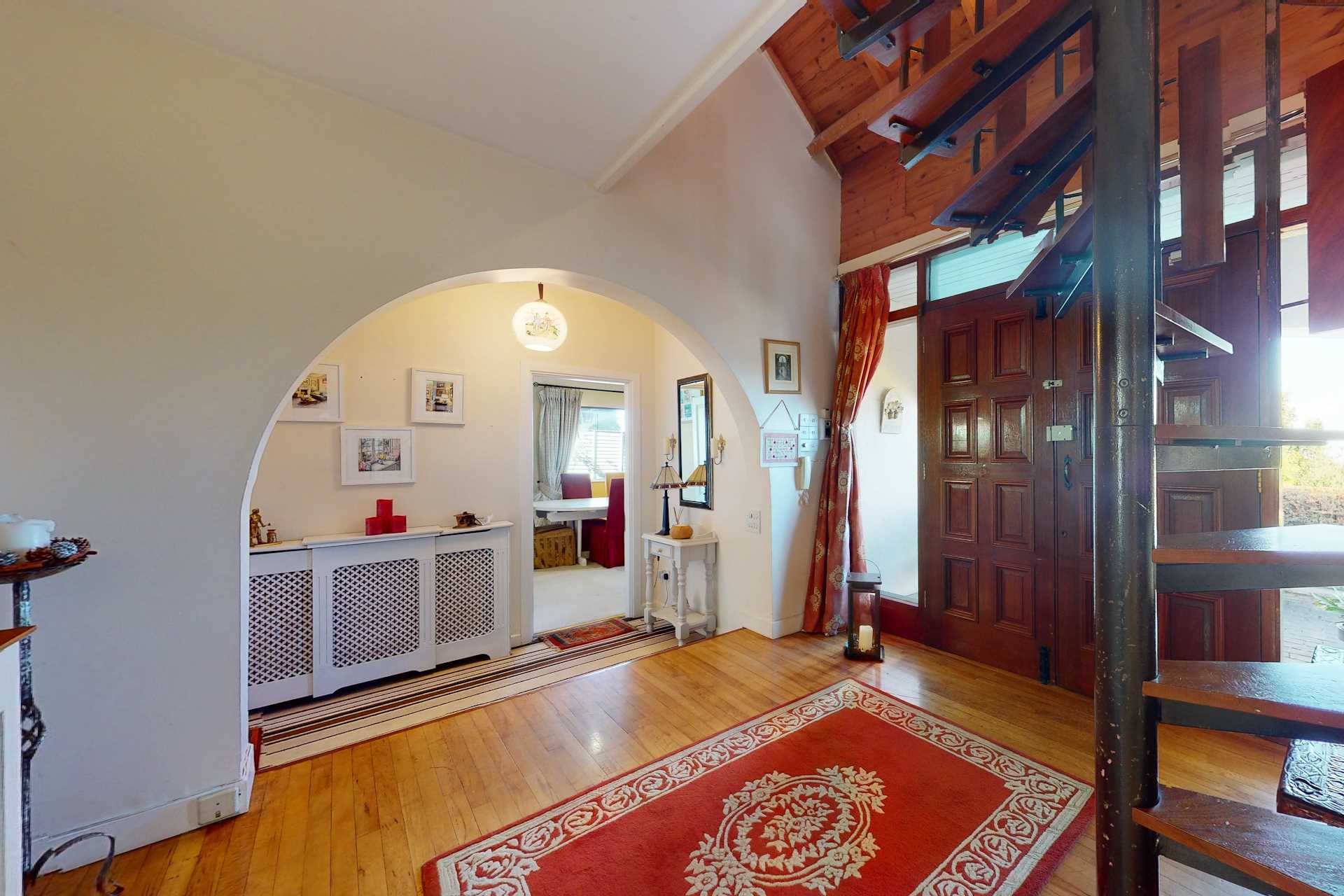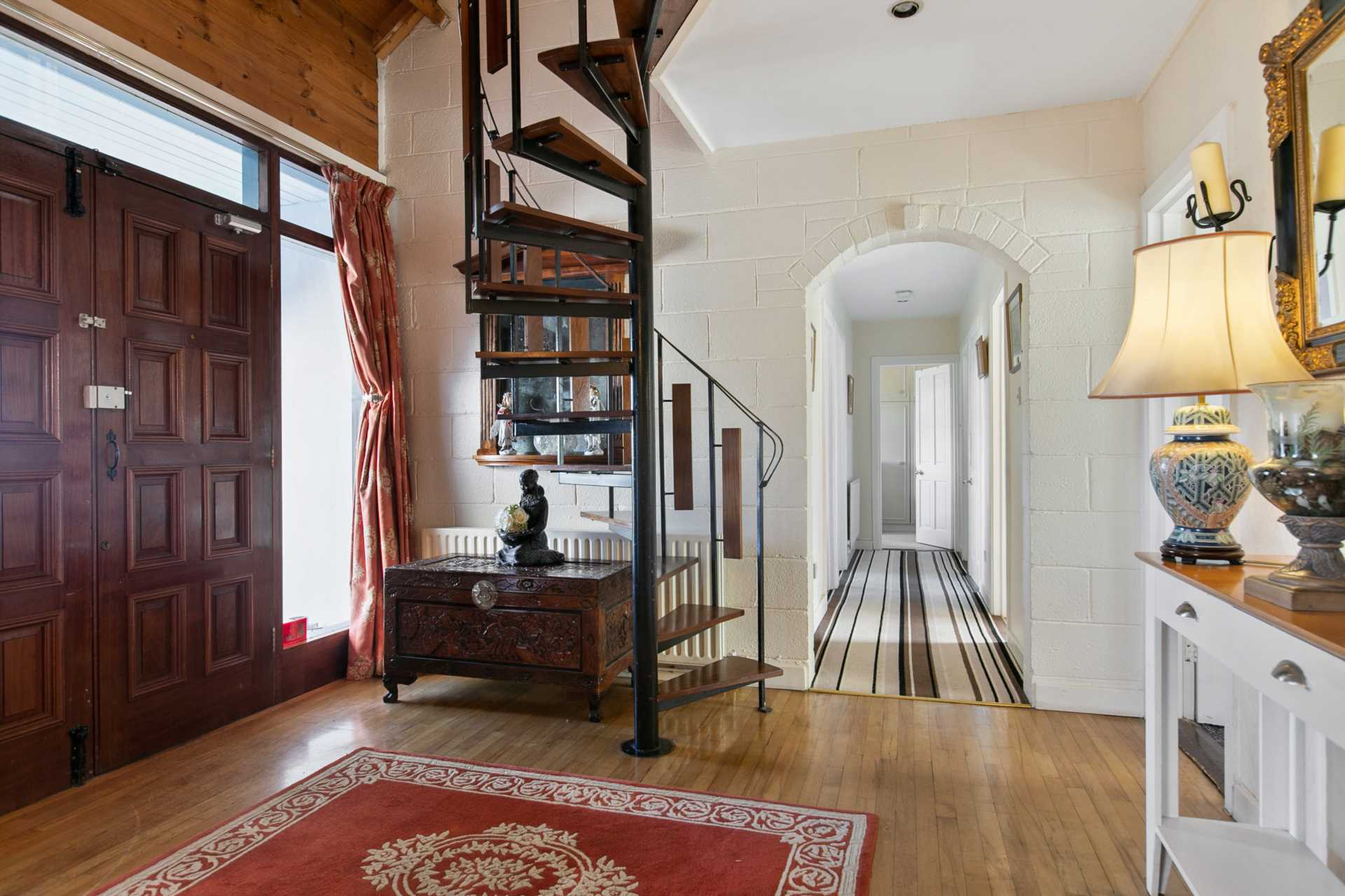 Wood flooring. Double hardwood front door flanked by windows. Lofted ceiling. Stairs to mezzanine. Hallway leading to bathrooms and bedrooms. Large hot press.