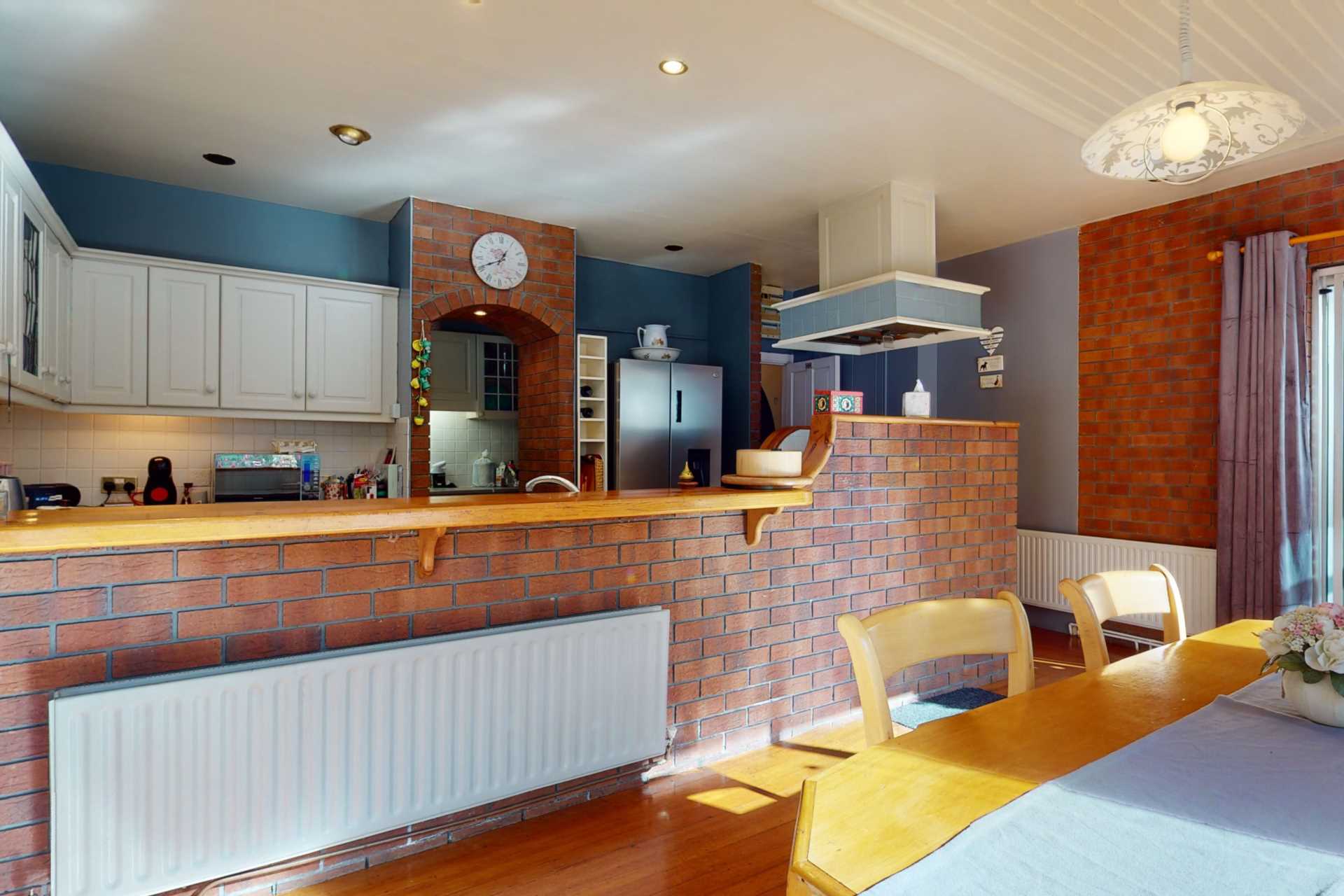 The sun floods into this space from a SW facing window and patio doors leading the conservatory and to the back garden. This is a lovely spacious room with room for a sizeable dining table and kitchen dresser. The kitchen area is separated by redbrick bar and work tops with additional press space under. Tiled kitchen area. Wood flooring in dining area. Oven, hob, hood, sink, dishwasher. There is a dedicated space designed to fit an American style fridge-freezer.