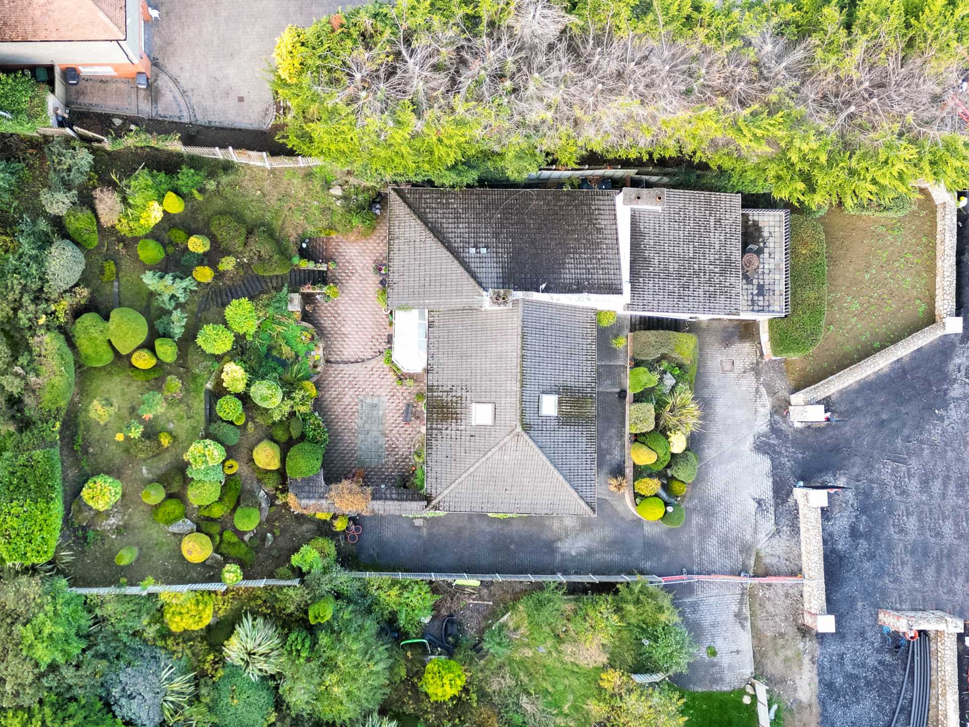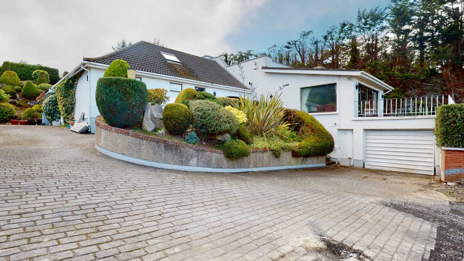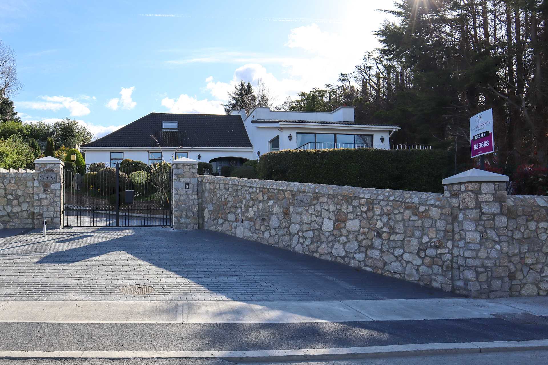 Entered via 4m wide electric gates between granite pillars set back from the newly widened Blackglen Road, giving space to stop off the main road while the gates open. Doors to garage. Side access 4,.5m wide with vehicular doors to rear patio, enabling one to drive around the back. New front lawn beside the gate will be set in grass. Sloped shrubbery in front of house. Plenty of parking space.