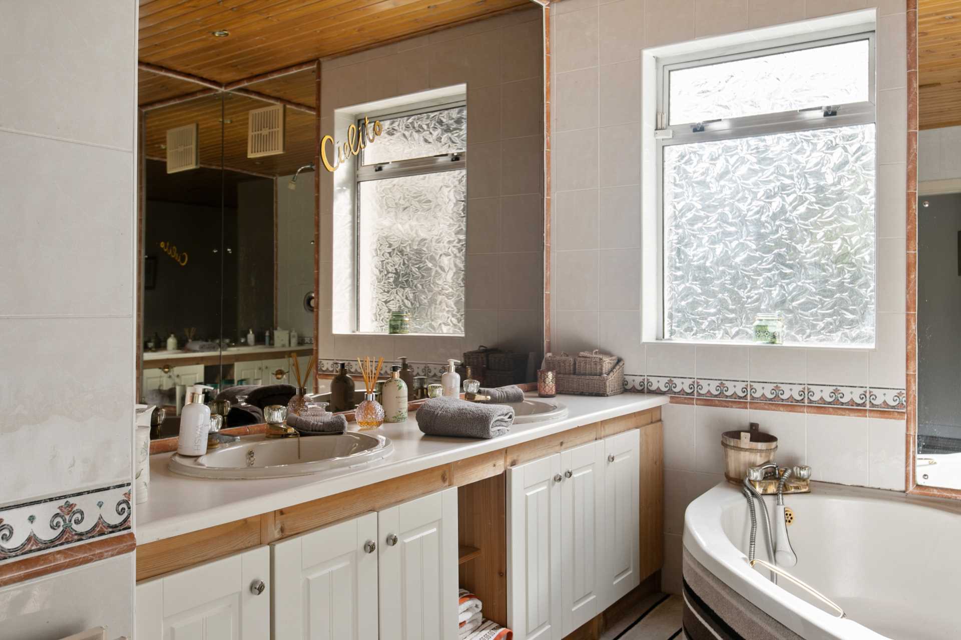 Corner bath. Large mirrors. Vanity unit with two wash hand basins and lit mirror. WC. Bidet. Tiled floor, Frosted glass window.