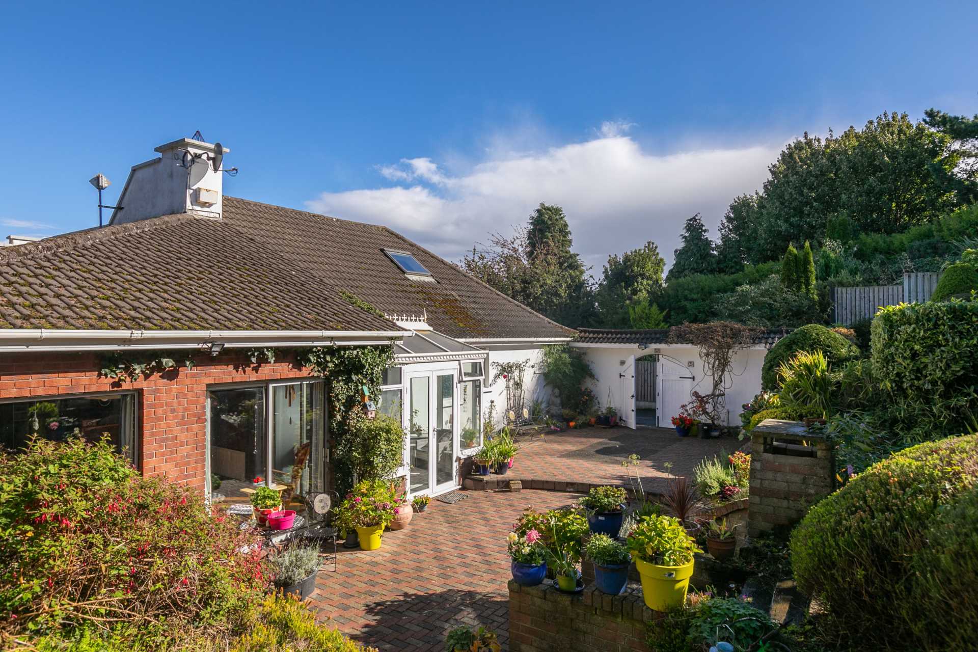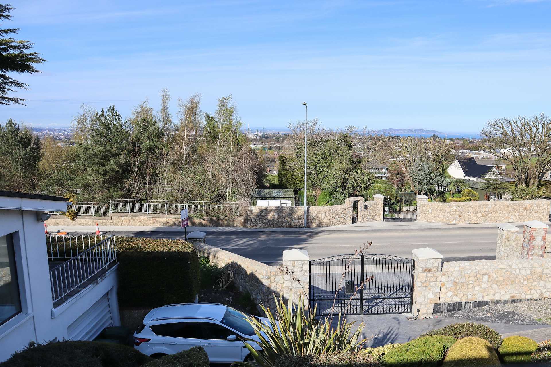 Large SW facing sun patio backed by a sloped garden. From the top of the garden there is a fantastic view across Dublin Bay. Garden pond. Outside loo. Outside tap. Brick built barbecue. Vehicular access via double doors on the east side. Access on the west side, leading to the front lawn, over 6ft wide.