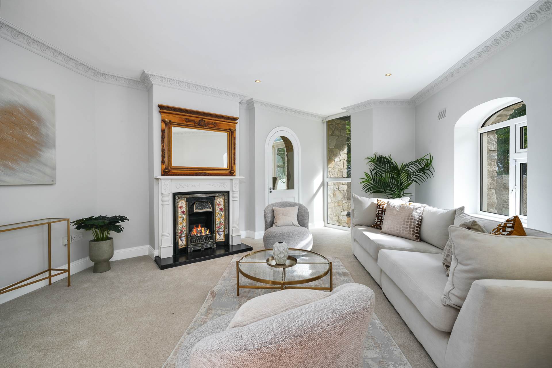 Fireplace with real flame gas fire, tiled inset and black stone hearth. Dual aspect windows. Recessed lighting. TV/Broadband point. Carpet. 9ft ceiling with coving. Polished wood flooring. Double doors to hall. Arched doorway to dining area.