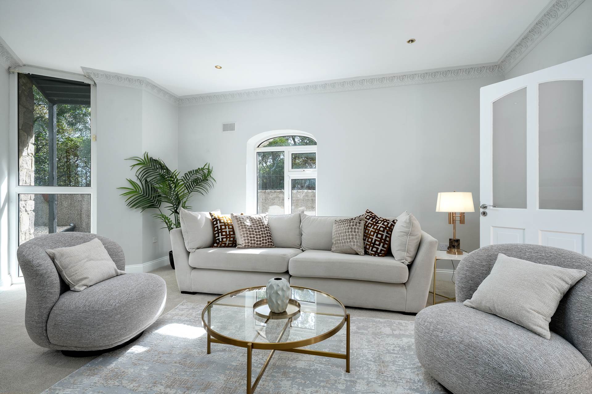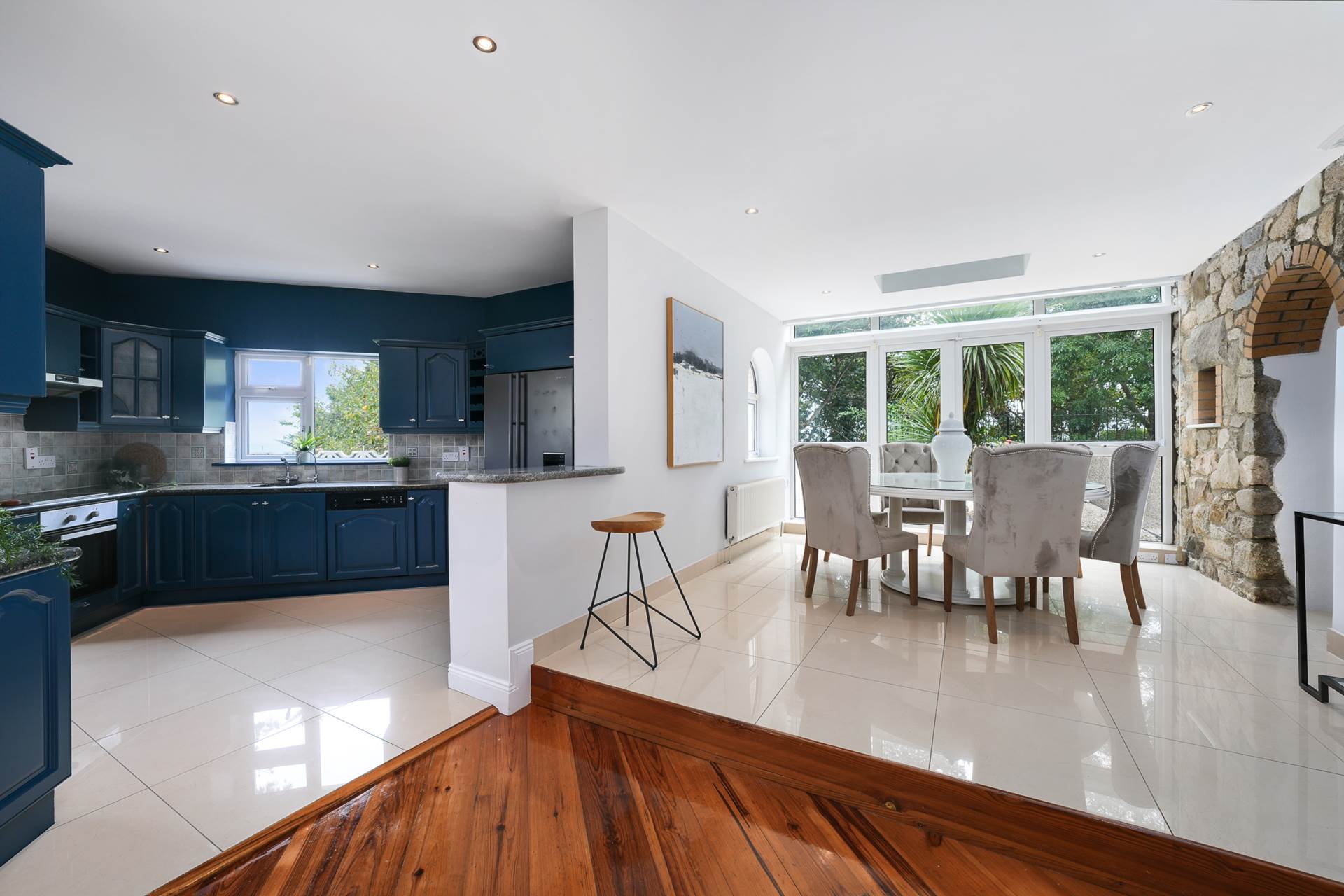 Ceramic tiled flooring. Wall-to-wall, full height glazed wall with French doors facing towards the sea. Granite feature wall with alcove and arched doorway. Lit recessed roof light. Recessed lighting.