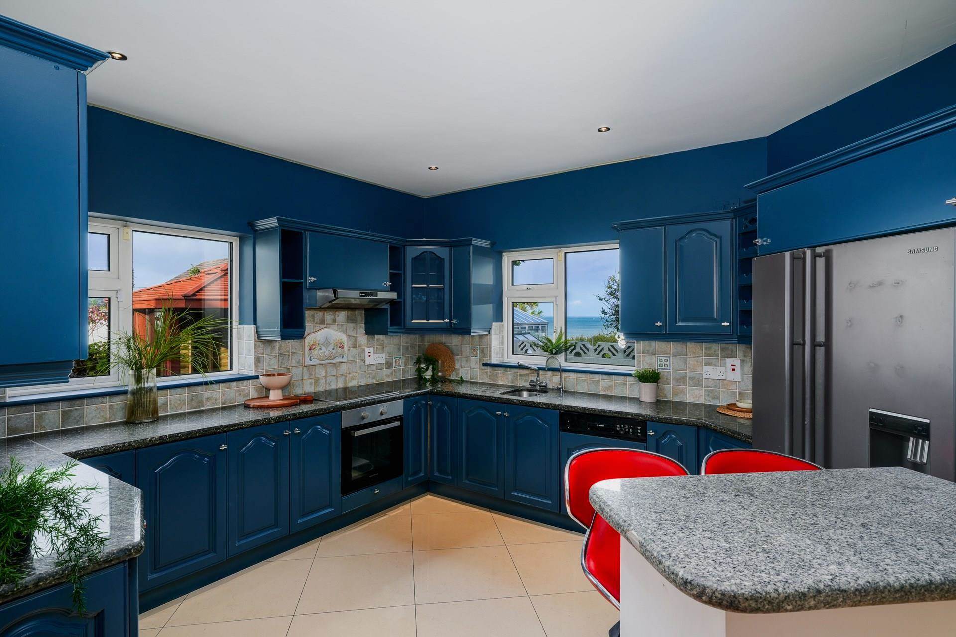 Dual aspect space with sea views. Fitted kitchen equipped with American style fridge-freezer, dishwasher, induction hob and plenty of press space. Granite counter tops. tiled splash back. Recessed lighting. 1 or 2 person breakfast bar. 9ft ceiling height.