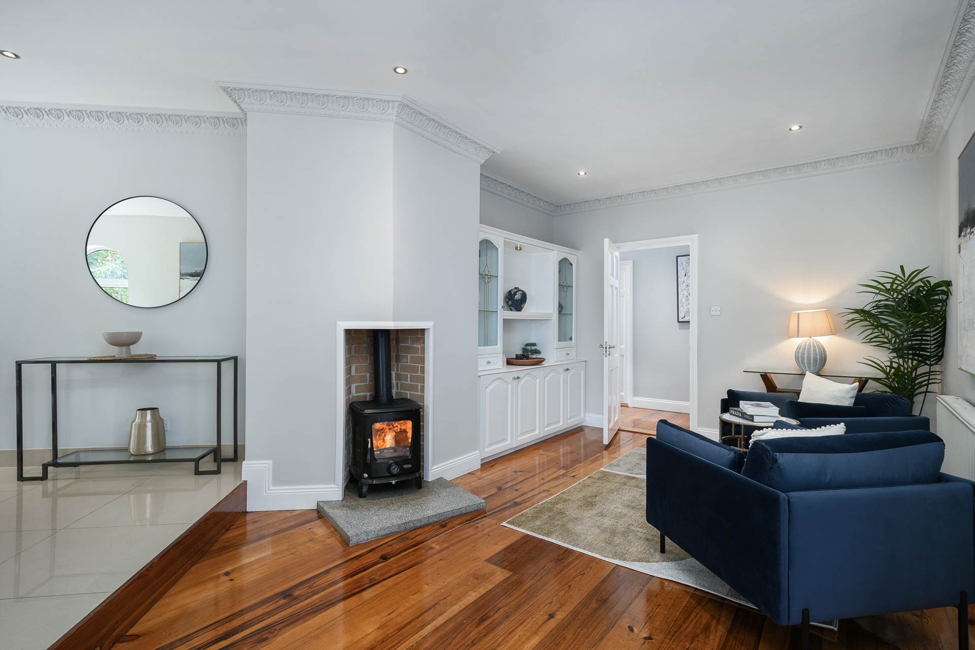 Solid fuel stove on a granite hearth. White lit sideboard display unit. Polished wood flooring. 9ft high ceiling with coving. Door to hall.