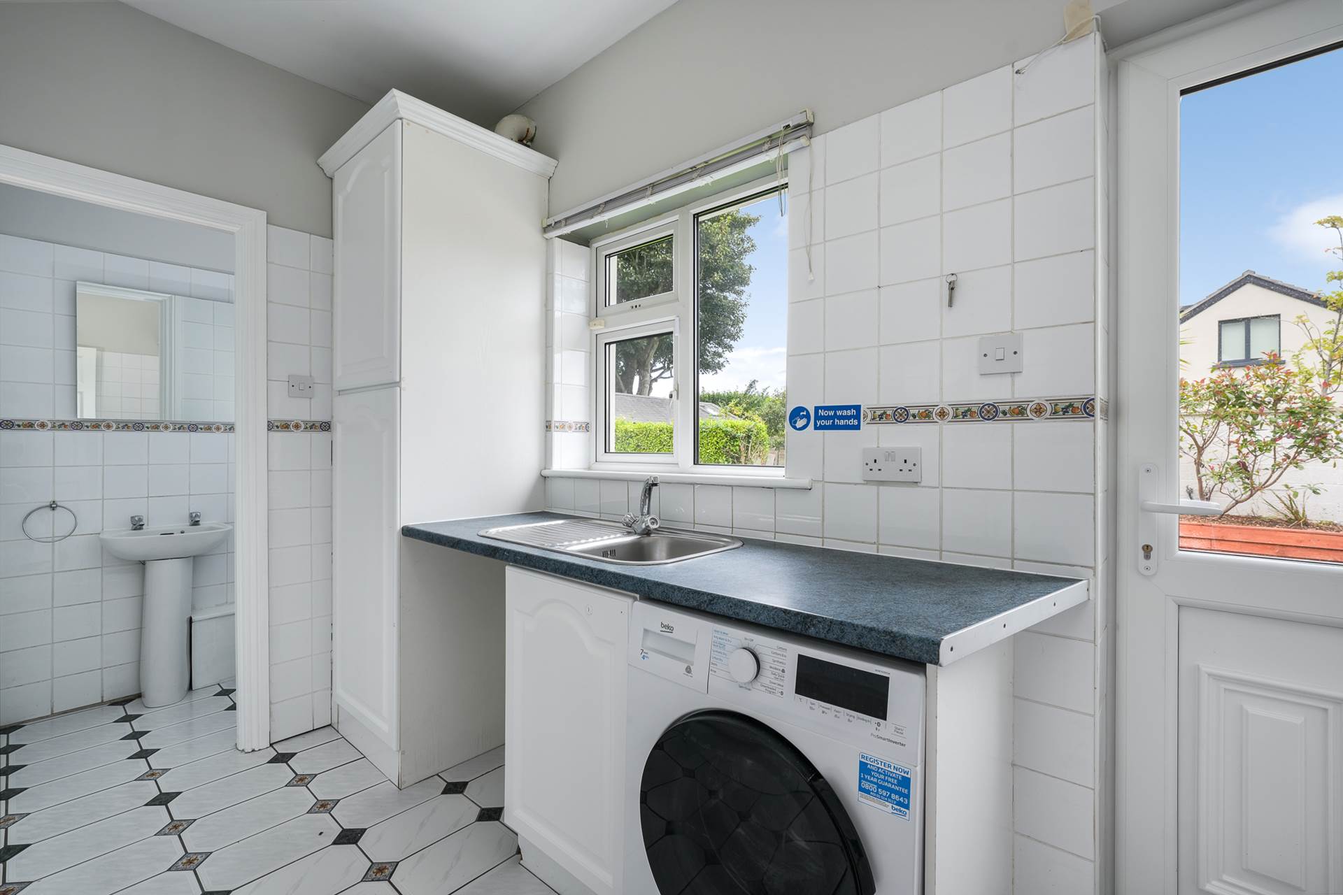 Tiled floor and walls. Window and glazed door to back garden. Stainless steel sink. Washer/Dryer. GFCH boiler. Broom press. Door to WC.
