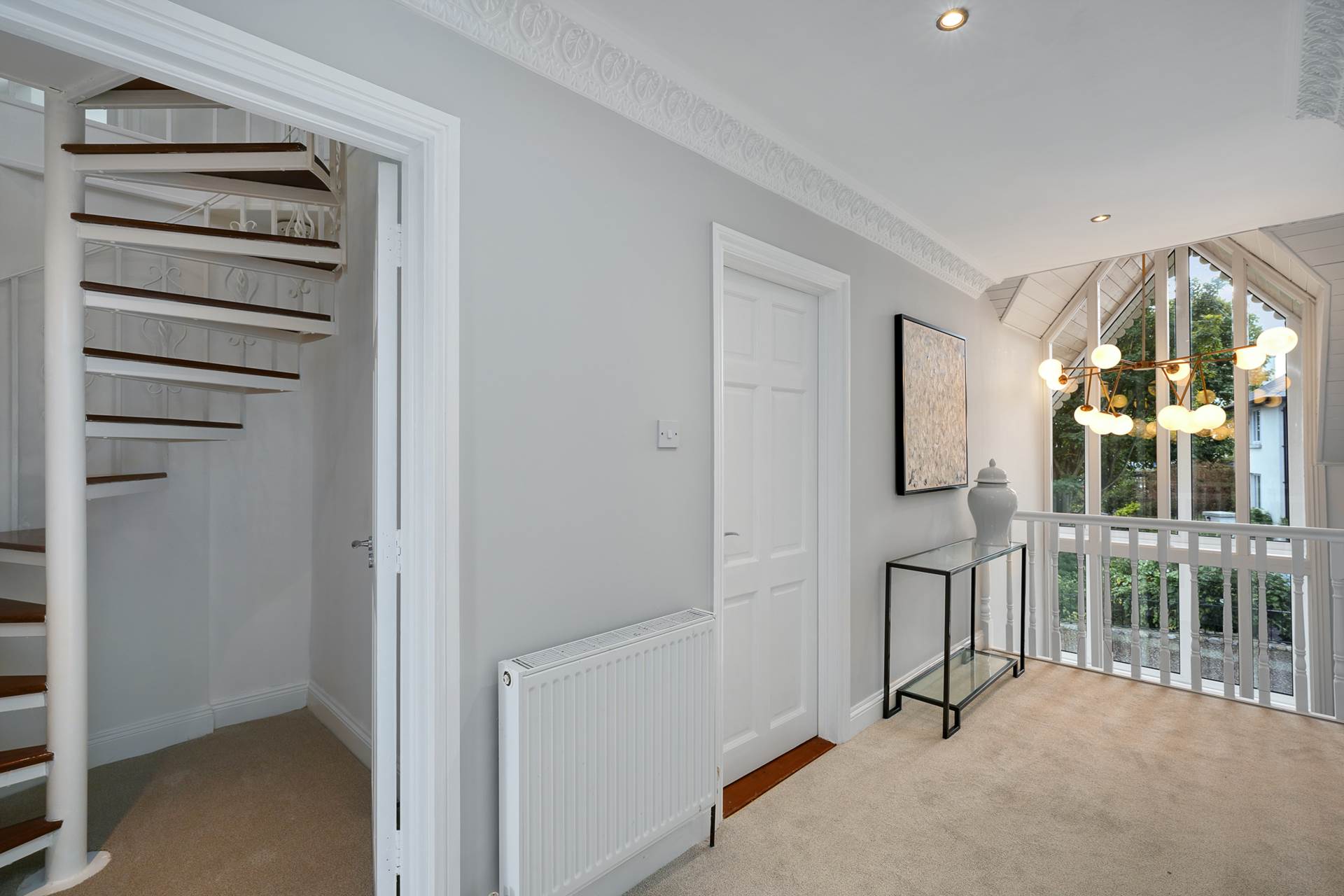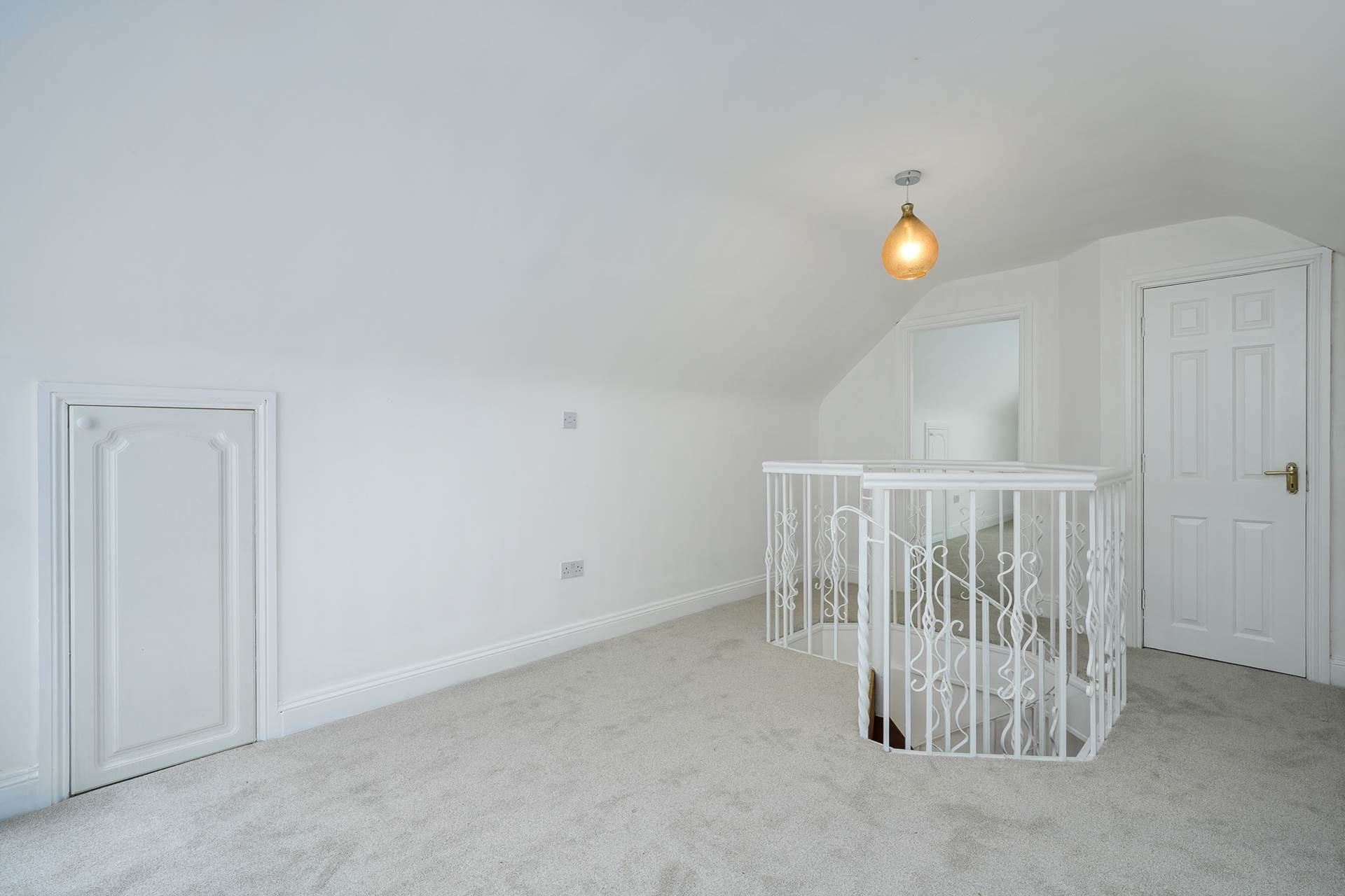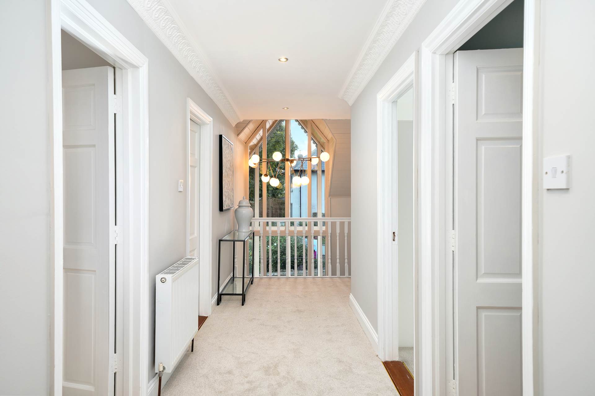 Spacious landing with great natural light flooding in from the void over the hall. Carpet. White painter banisters. Recessed lighting. Coving.