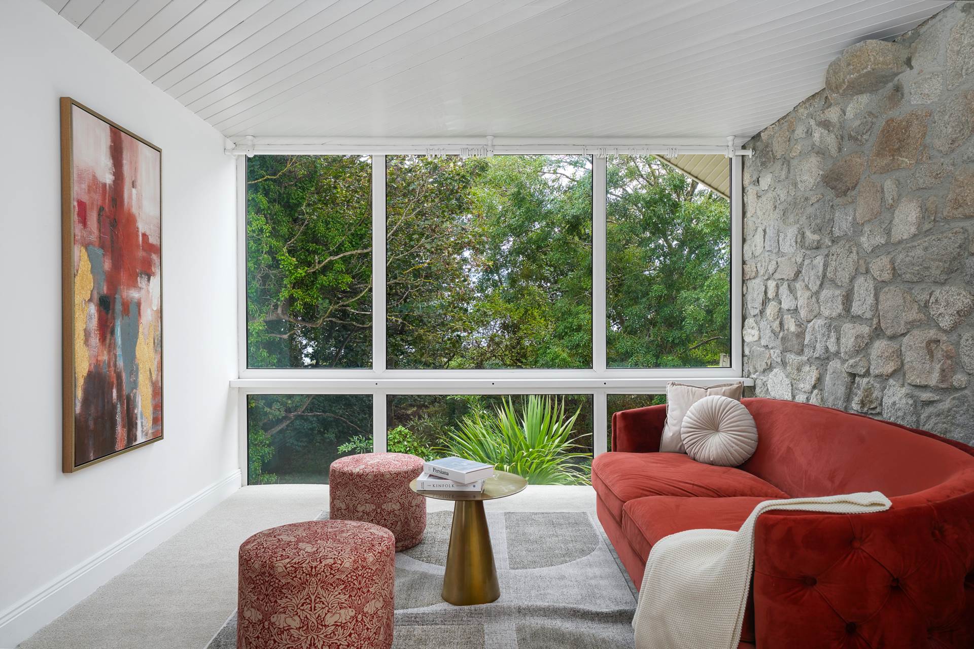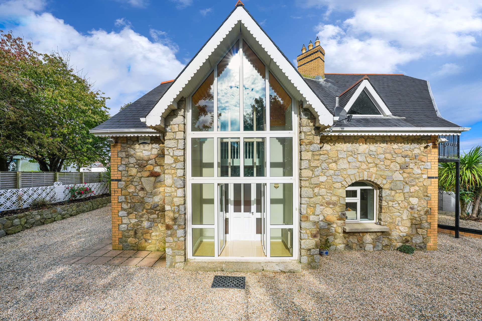 A dramatic feature space, fully glazed with external granite walls, stretching 6m from floor to lofted ceiling. White ceramic tiled floor.