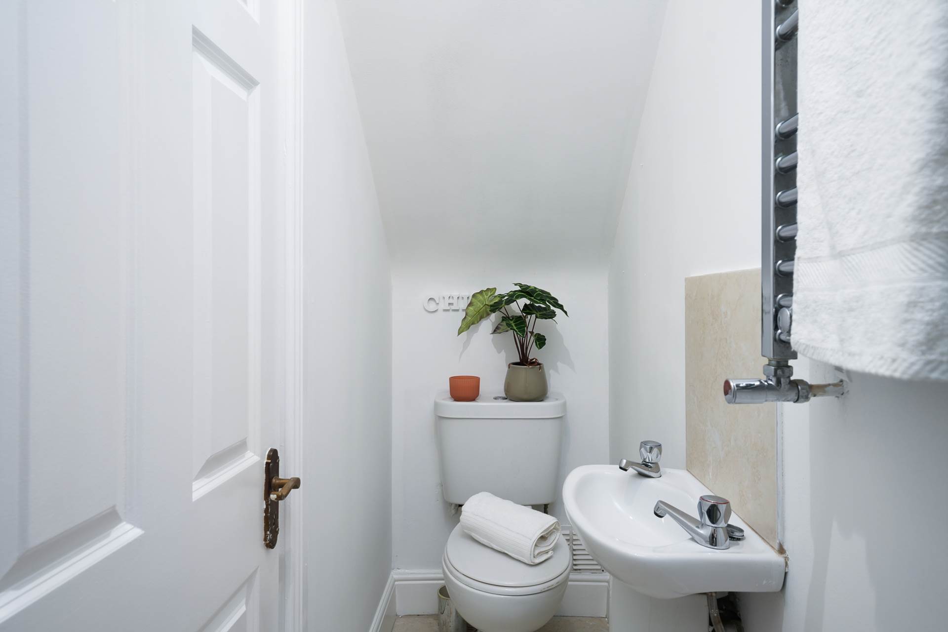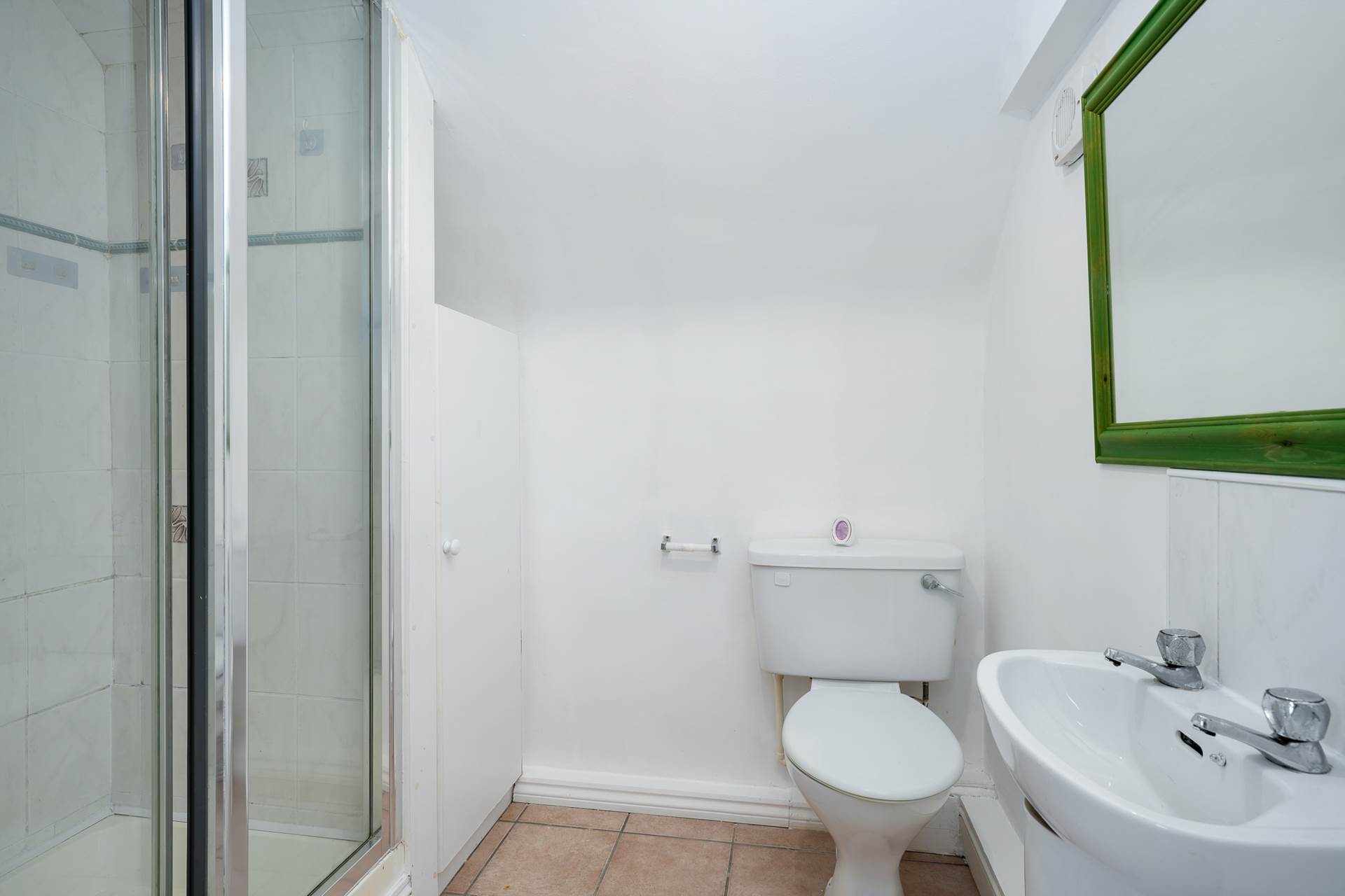 Tiled floor. Shower cubicle. WC. WHB. Heated towel rail.