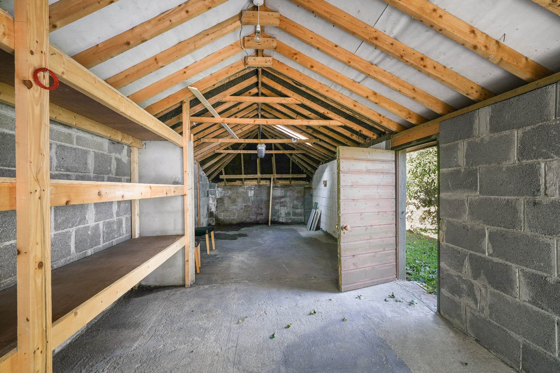Block built workshop with skylight and two doors. Currently fitted with shelving. This could be adapted to a range of purposes, such as a playhouse or studio.