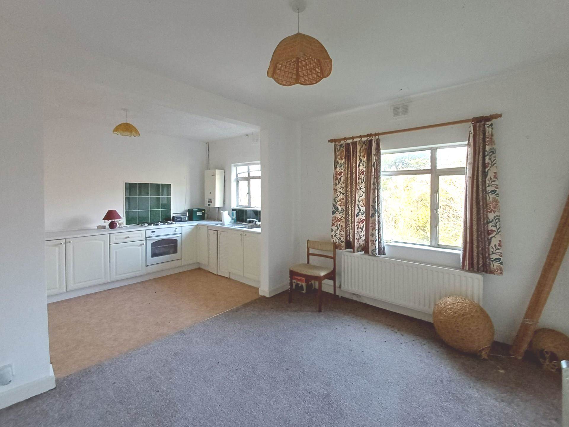 Accommodation consists of an entrance lobby to the side of the building. Behind this is a utility/strore room with a separate outside door. Up the stairs is a spacious landing with two windows a cloak room and a storage press. To the right is a spacious living room with an open fireplace fitted with an instant flame gas fire. Along the back are the bathroom, kitchen with interconnecting dining room (originally a 3rd bedroom), and a back bedroom.The main bedroom is to the front. Both bedrooms are large king sized rooms.