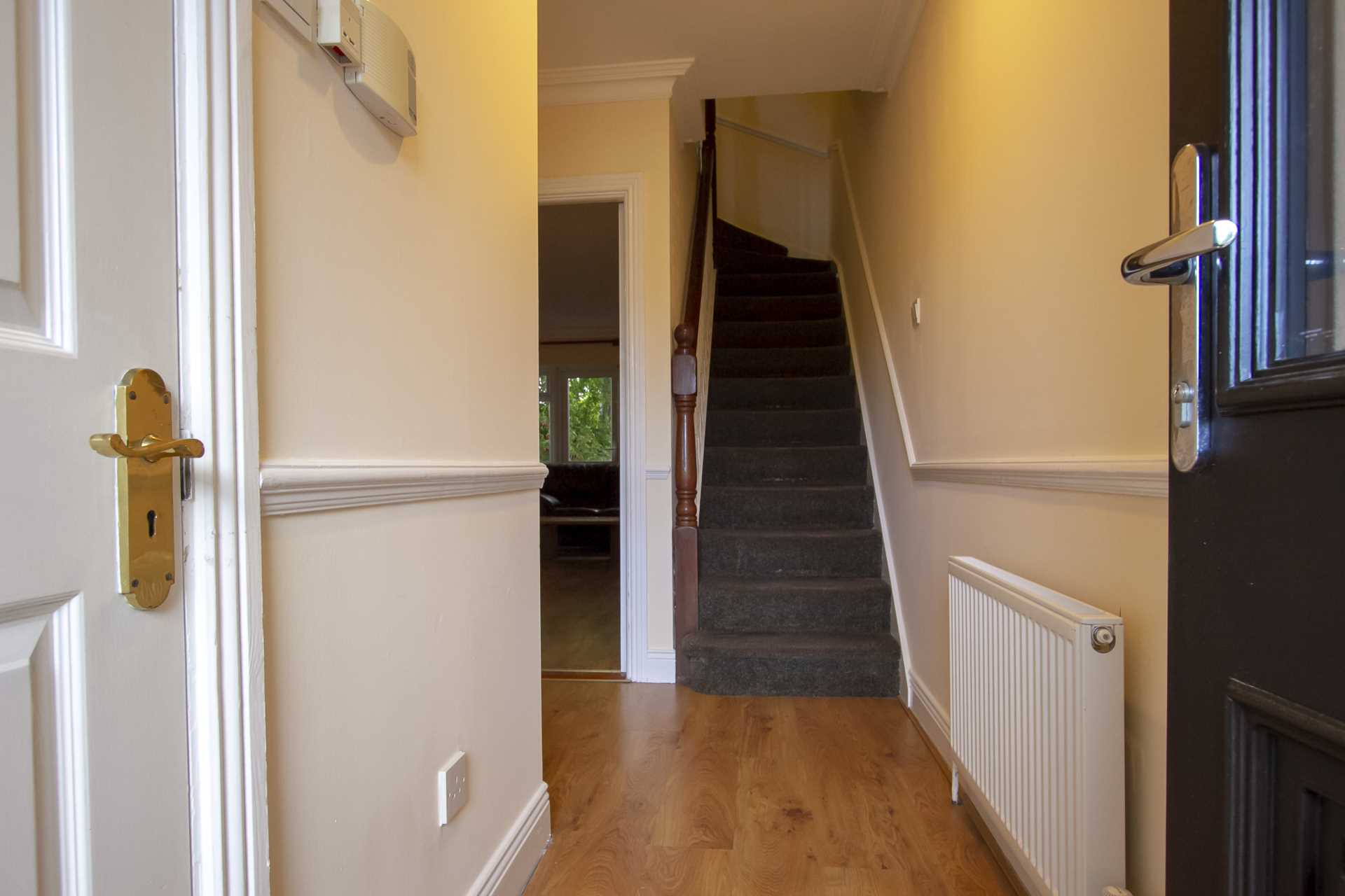 With laminated timber floor and doors to patio area and rear garden
