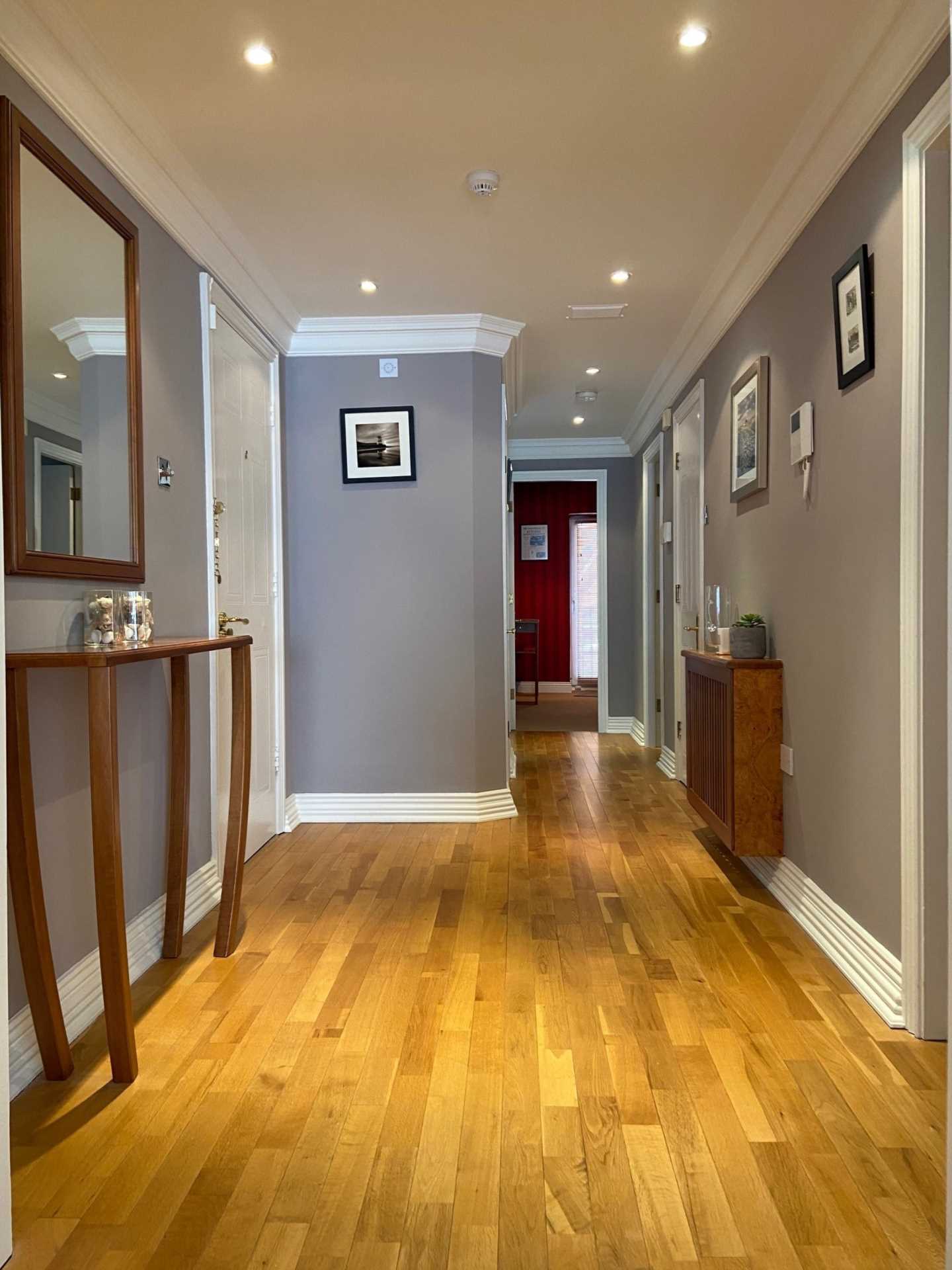 comprises of a hall with two storage closets, a south facing bay windowed living room and stylish