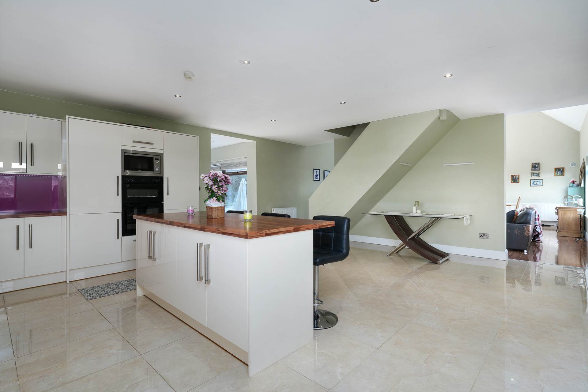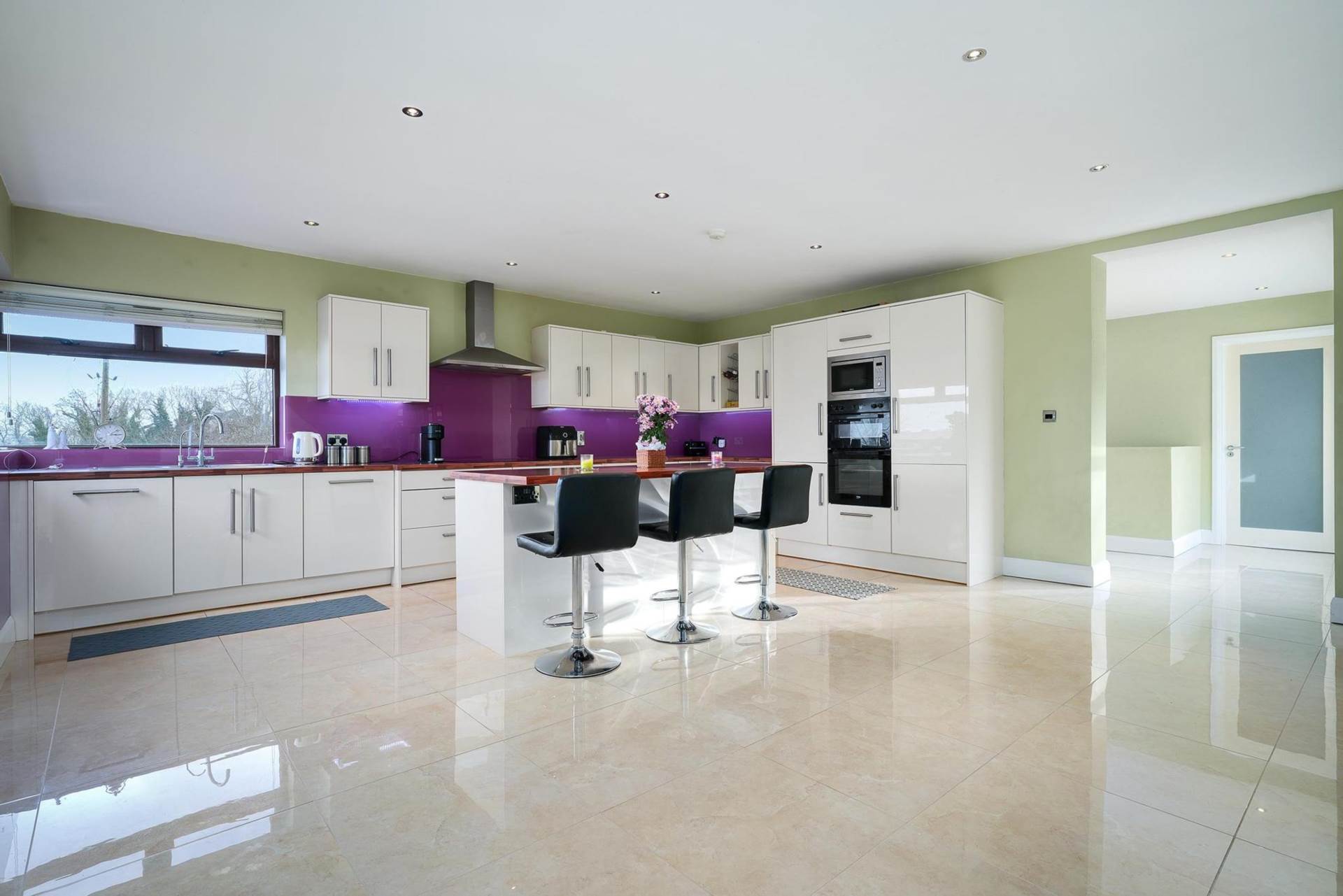 Spacious room with corner window looking across the countryside towards the sea. Modern fully equipped kitchen with fridge/freezer, larder unit, double oven, electric induction hob, integrated microwave, stainless steel sink with rinse bowl bin drawer. Island with space for three stools. Ceramic floor tiles. Recessed lighting. Space for full-sized dining table.