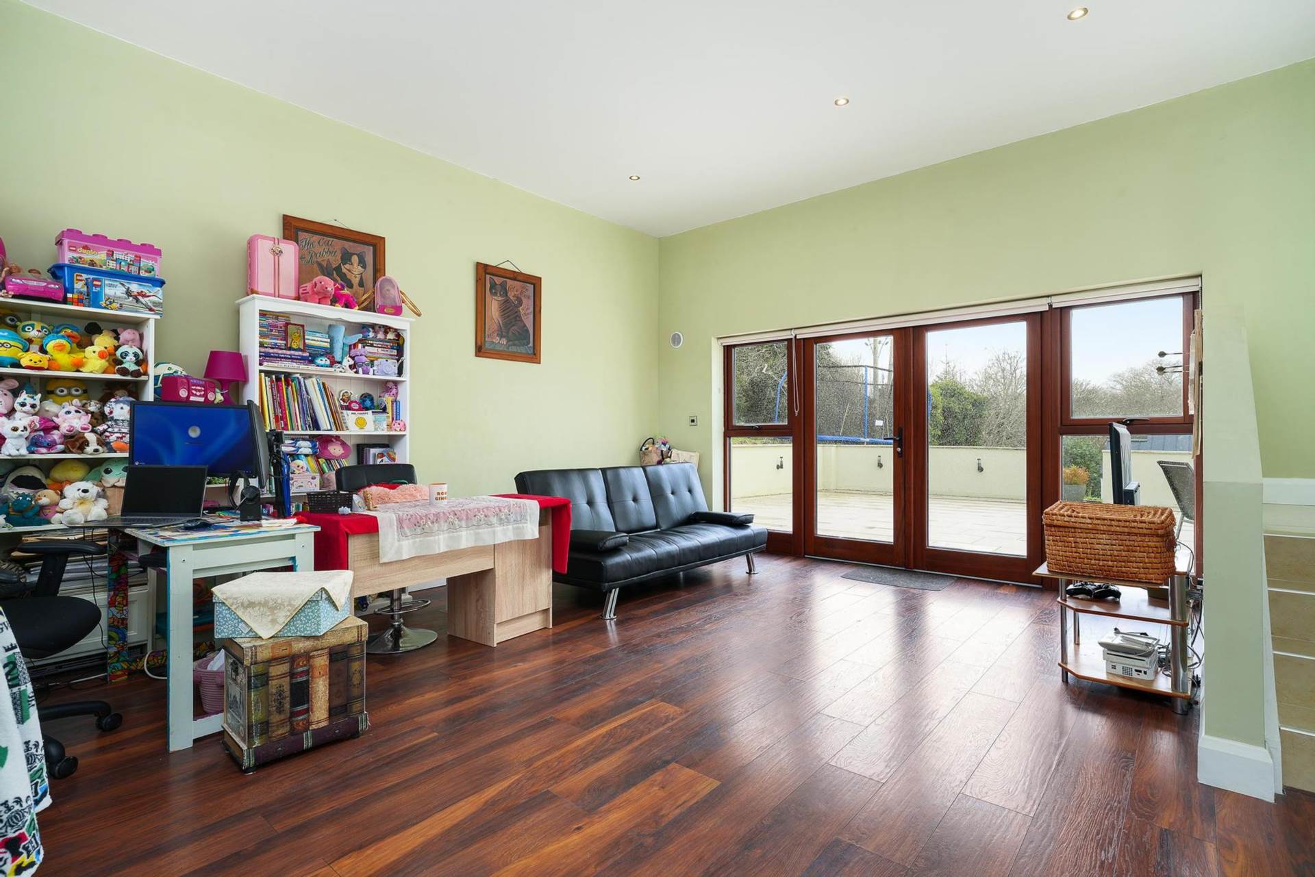 Lovely bright room with six windows - two south facing towards sun terrace, one west facing and three north facing with expansive views of The Sugar Loaf, The Scalp, and Carrickgollogan. Soaring lofted ceiling 4m high with recessed lighting. Wood effect flooring. This room currently is furnished with a second dining table - but it probably works best as a dedicated living room.