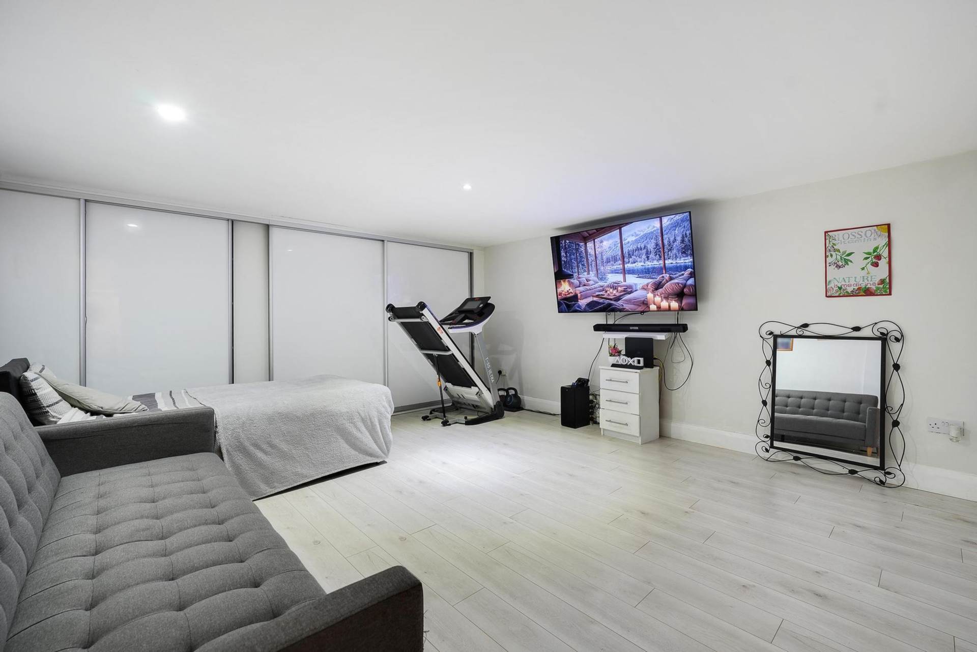 Extensive storage along two sides. TV point. White wood laminate flooring. Recessed lighting. Ceiling height 2.06m. No windows. Central ventilation system.