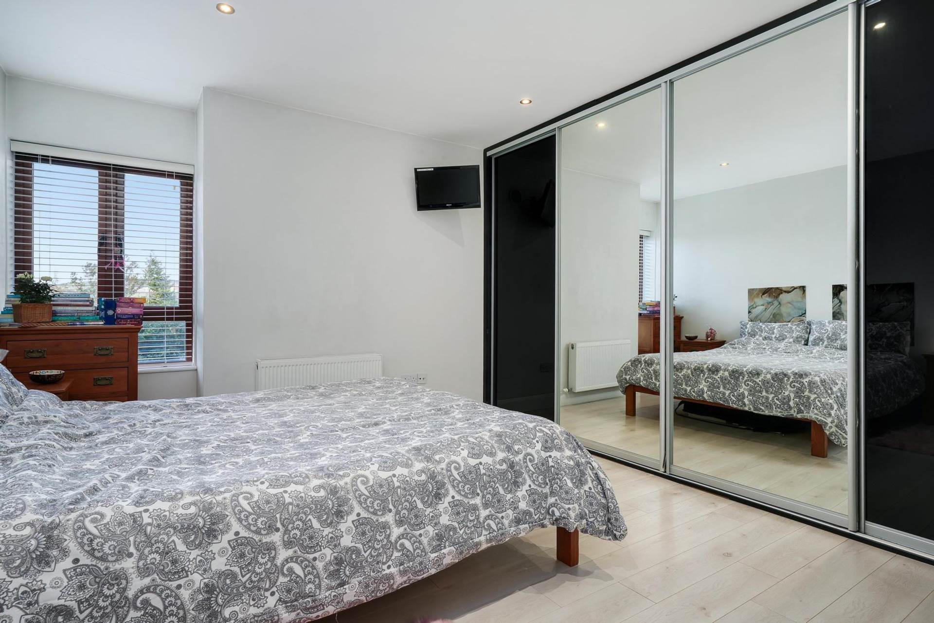 Full length sliderobe with mirrored doors. White wood laminate flooring. Window with blinds. View towards The Scalp. TV point. Door to bathroom.