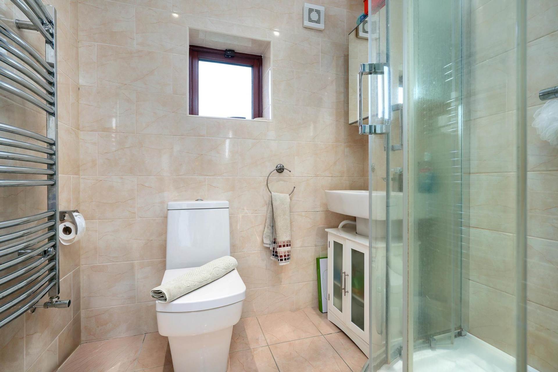 Tiled floor. Small frosted glass window. Shower cubicle. WC. WHB. Heated towel rail.