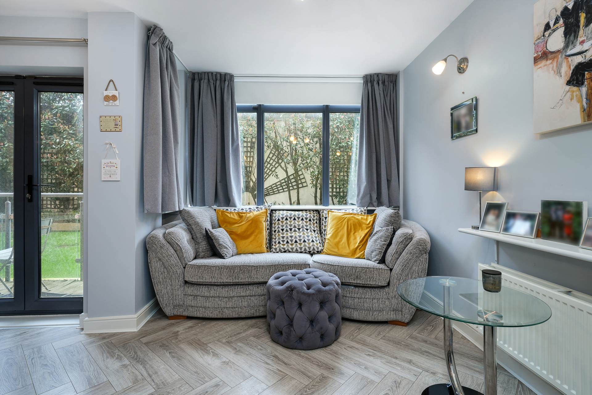 L-shaped, Wooden flooring, Door to Balcony (2.8 x 1.0) overlooking garden, south-facing, open to kitchen. Bay window (2.5 x 2.3)