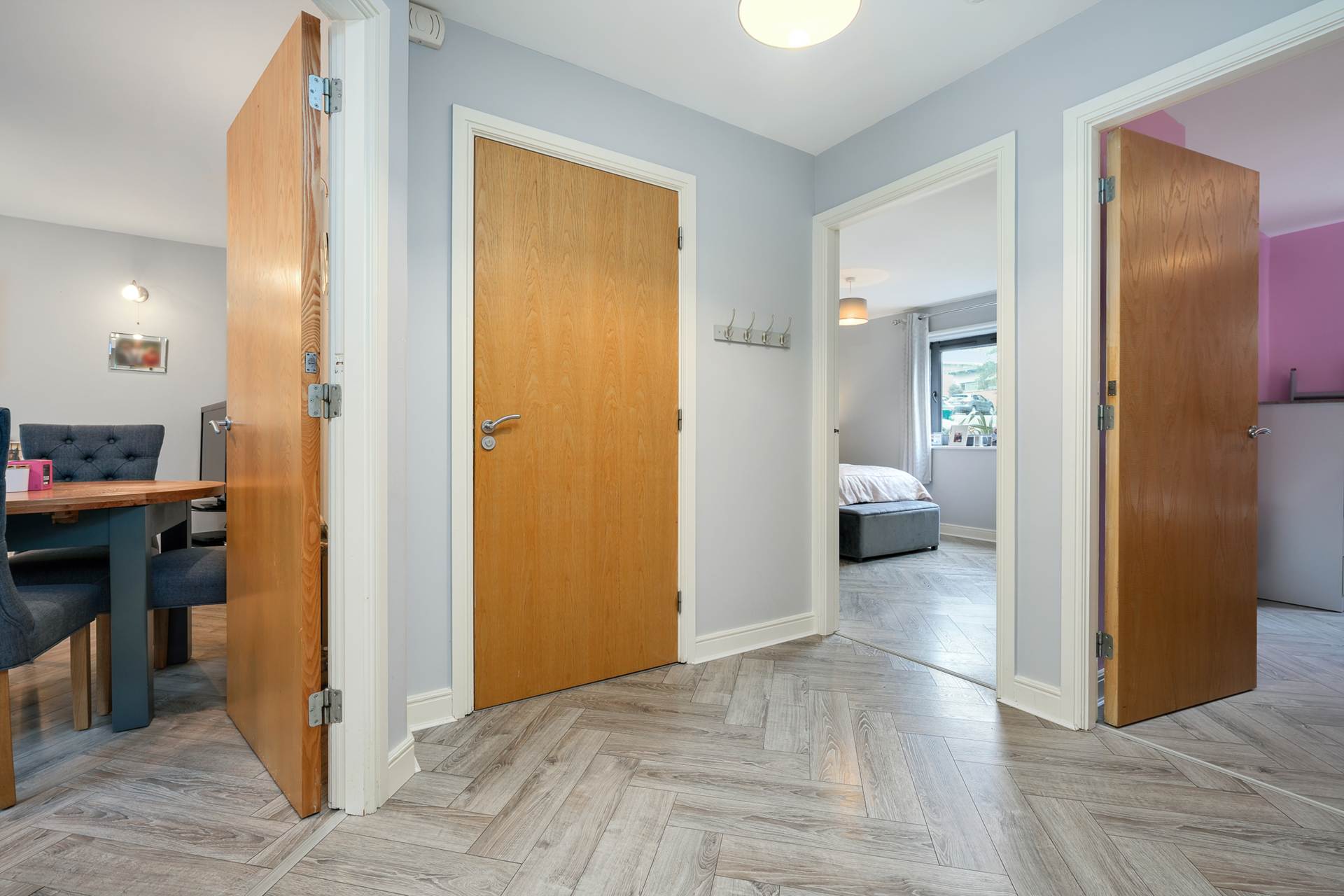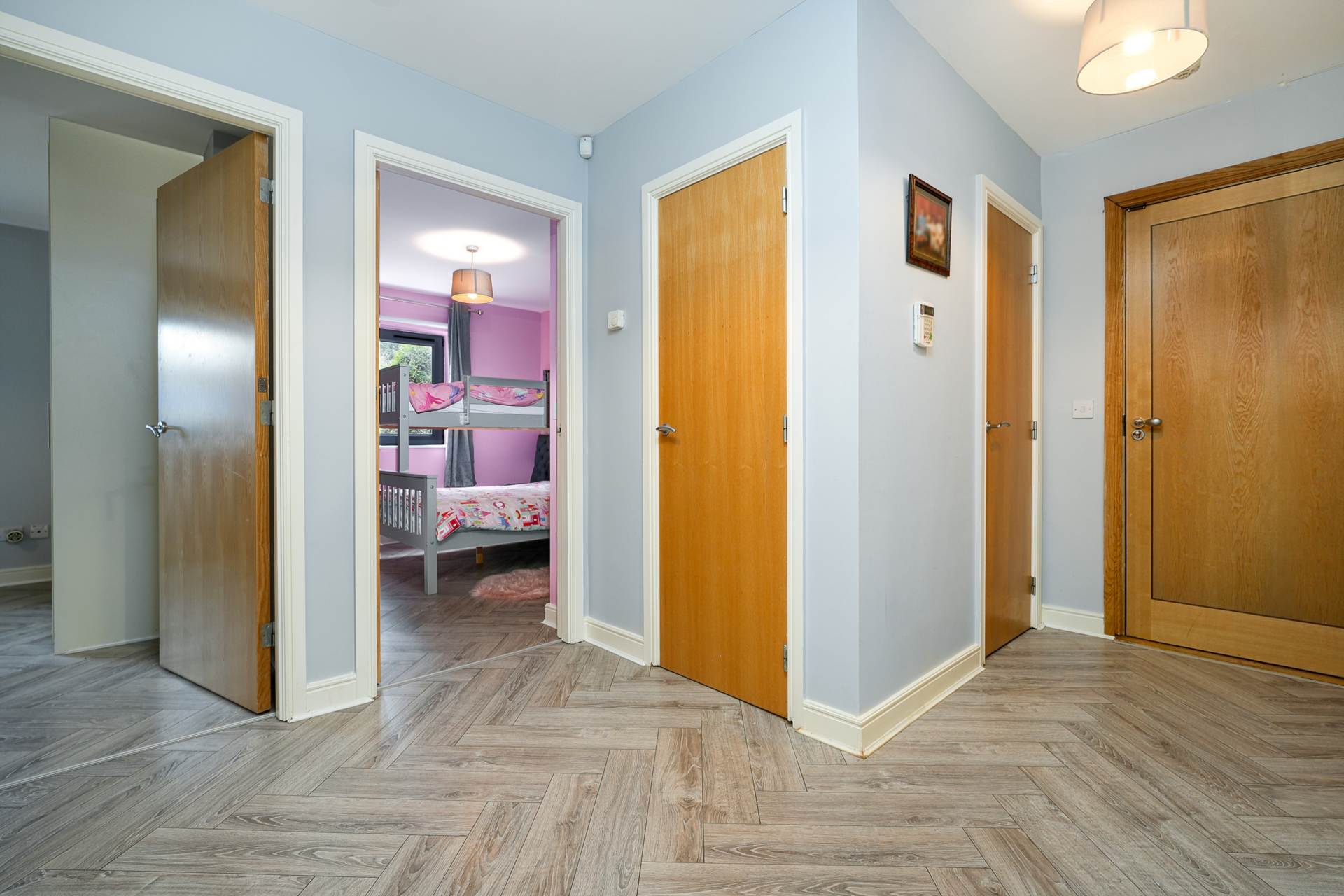 Solid wooden flooring, Fitted wardrobes, door to