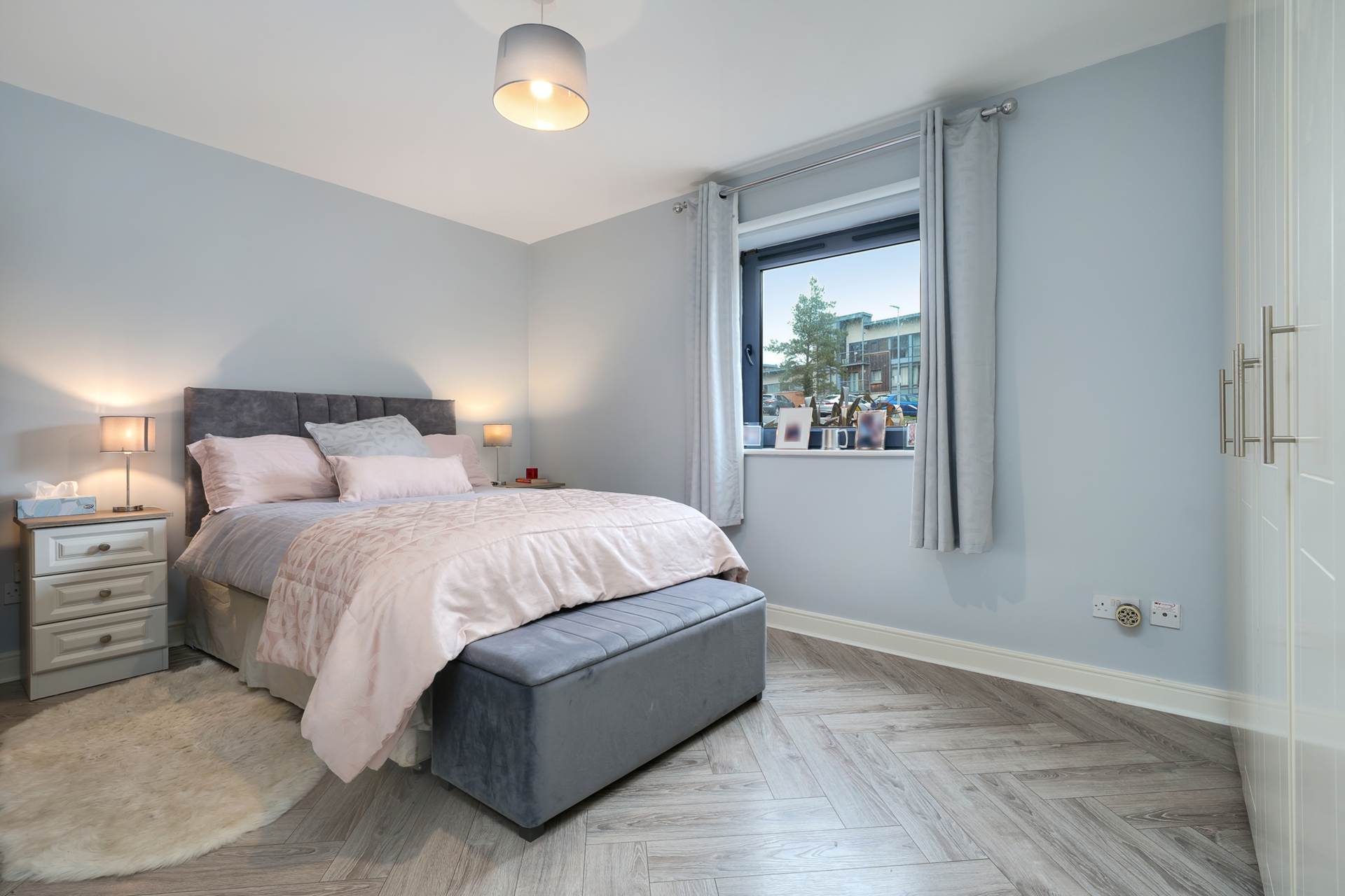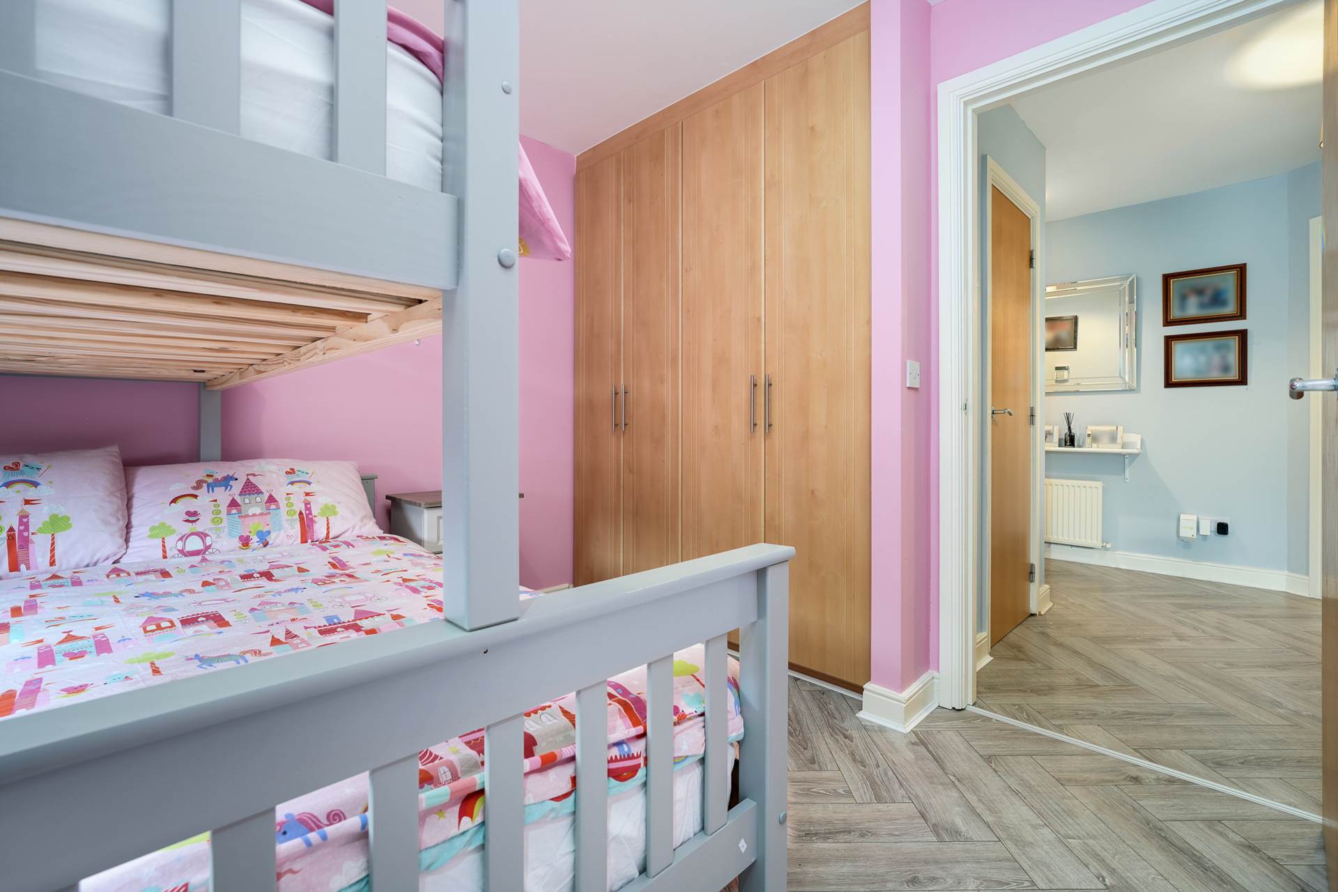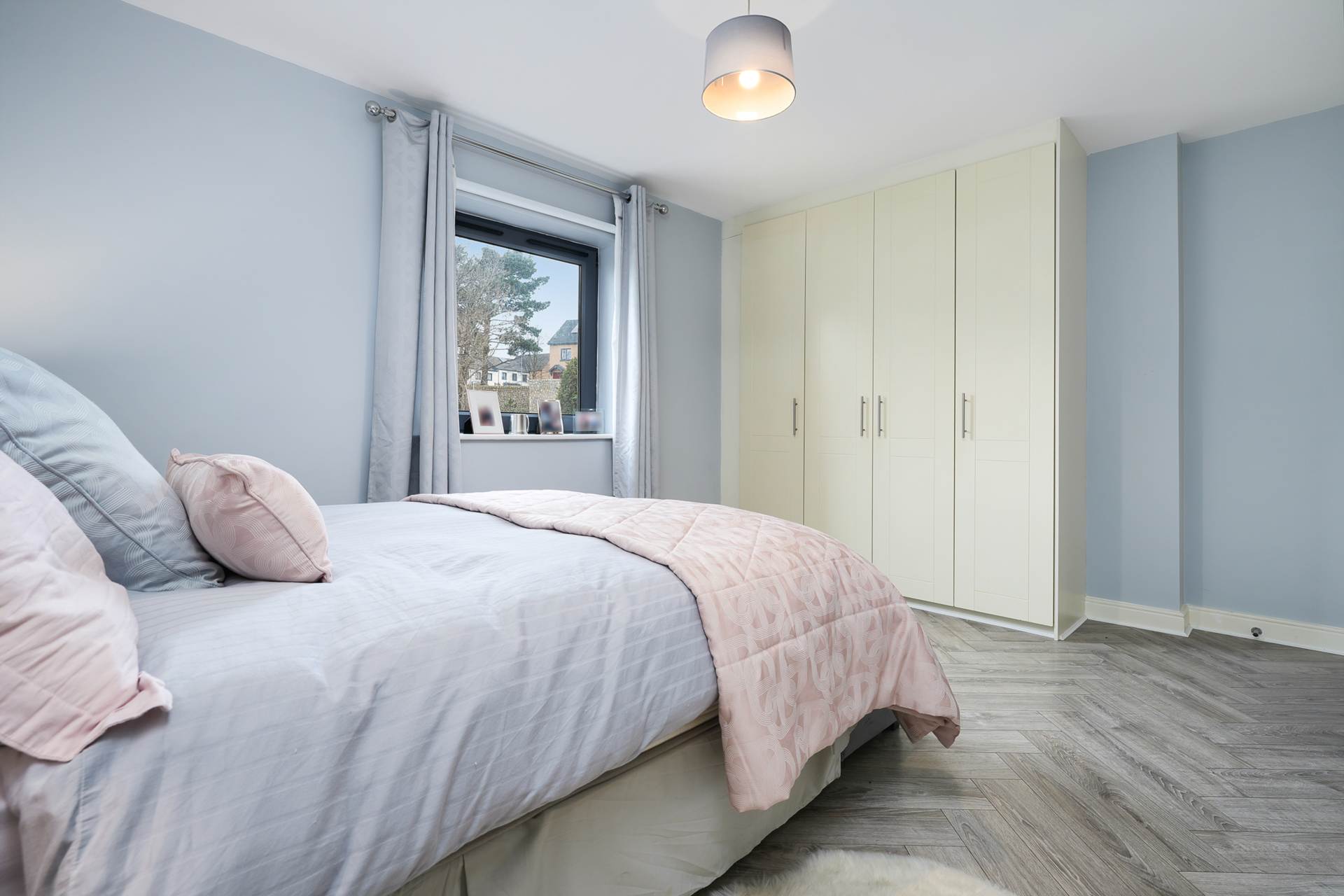 Double bedroom with solid wood flooring, fitted wardrobes.
