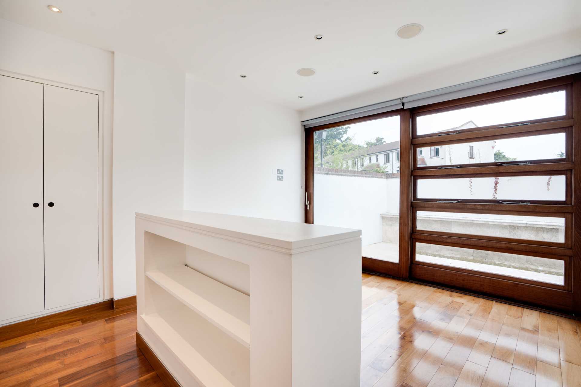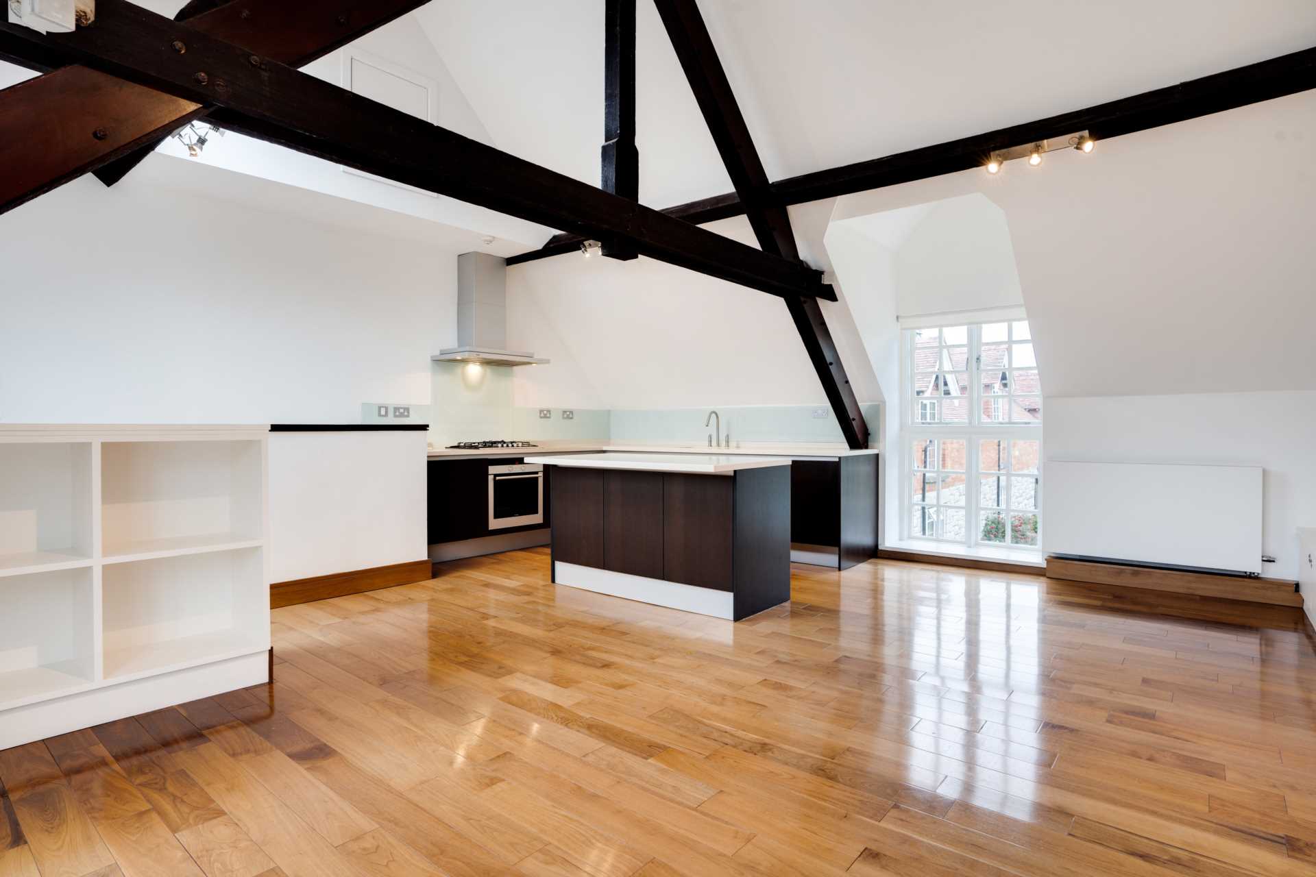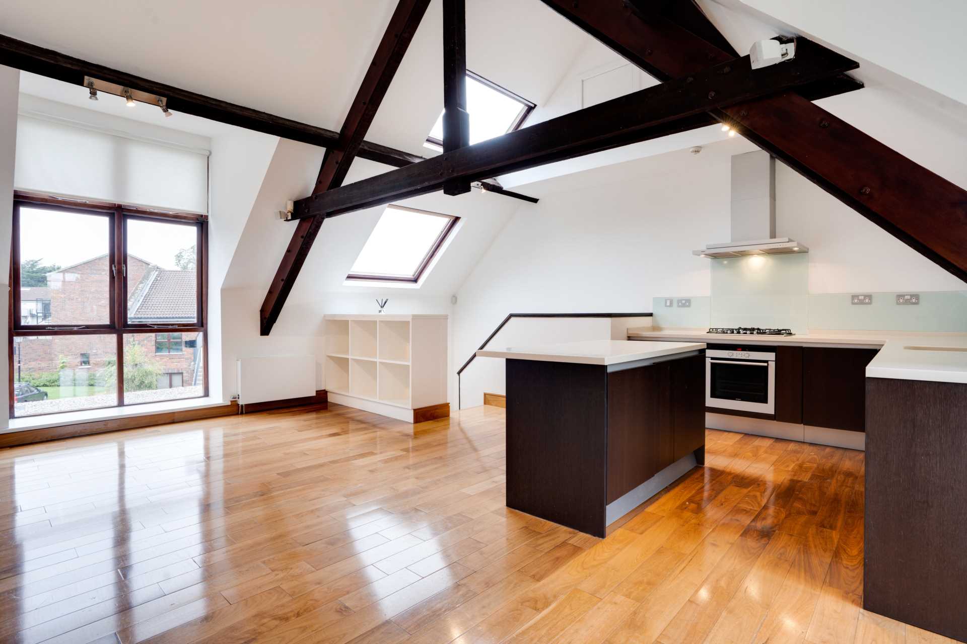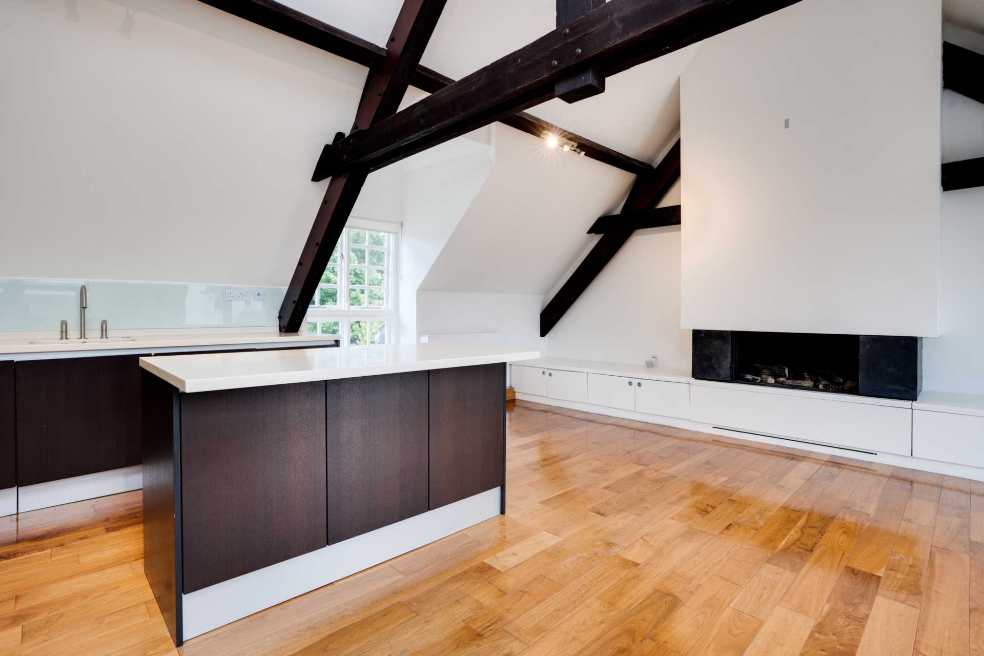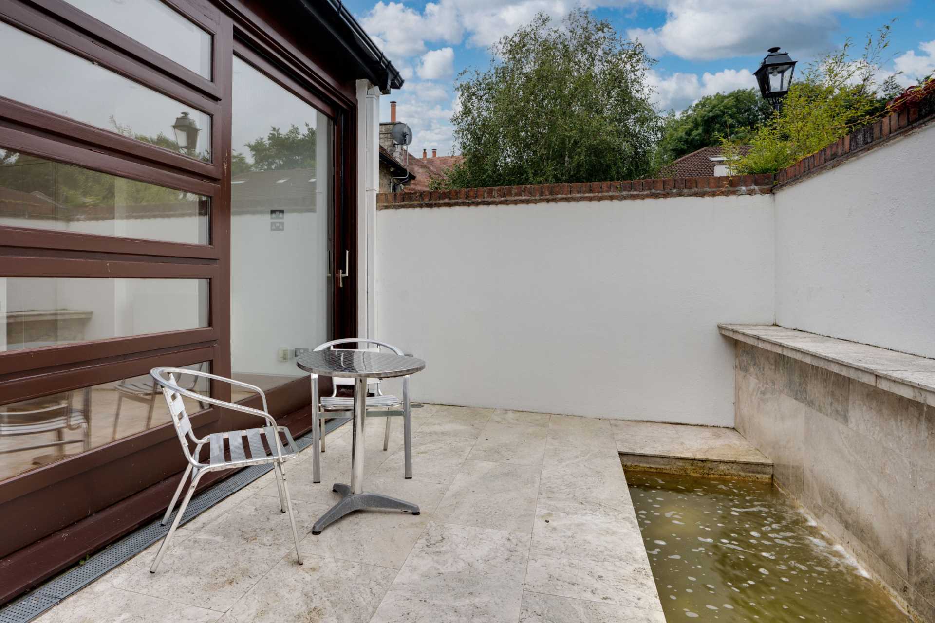 The accommodation on the ground floor comprises of a welcome entrance hall with high ceiling and coving, cloak room, two double bedrooms both with built-in wardrobes and bathroom with porcelain stone. There is a beautifully patio terrace to the rear with signature surrounding fountain. Upstairs there is a large open plan kitchen/living and dining room with a floor to ceiling window to the front and two large Velux windows to the rear. This living space is magnificent and features a stunning vaulted timber ceiling with exposed timber beams.