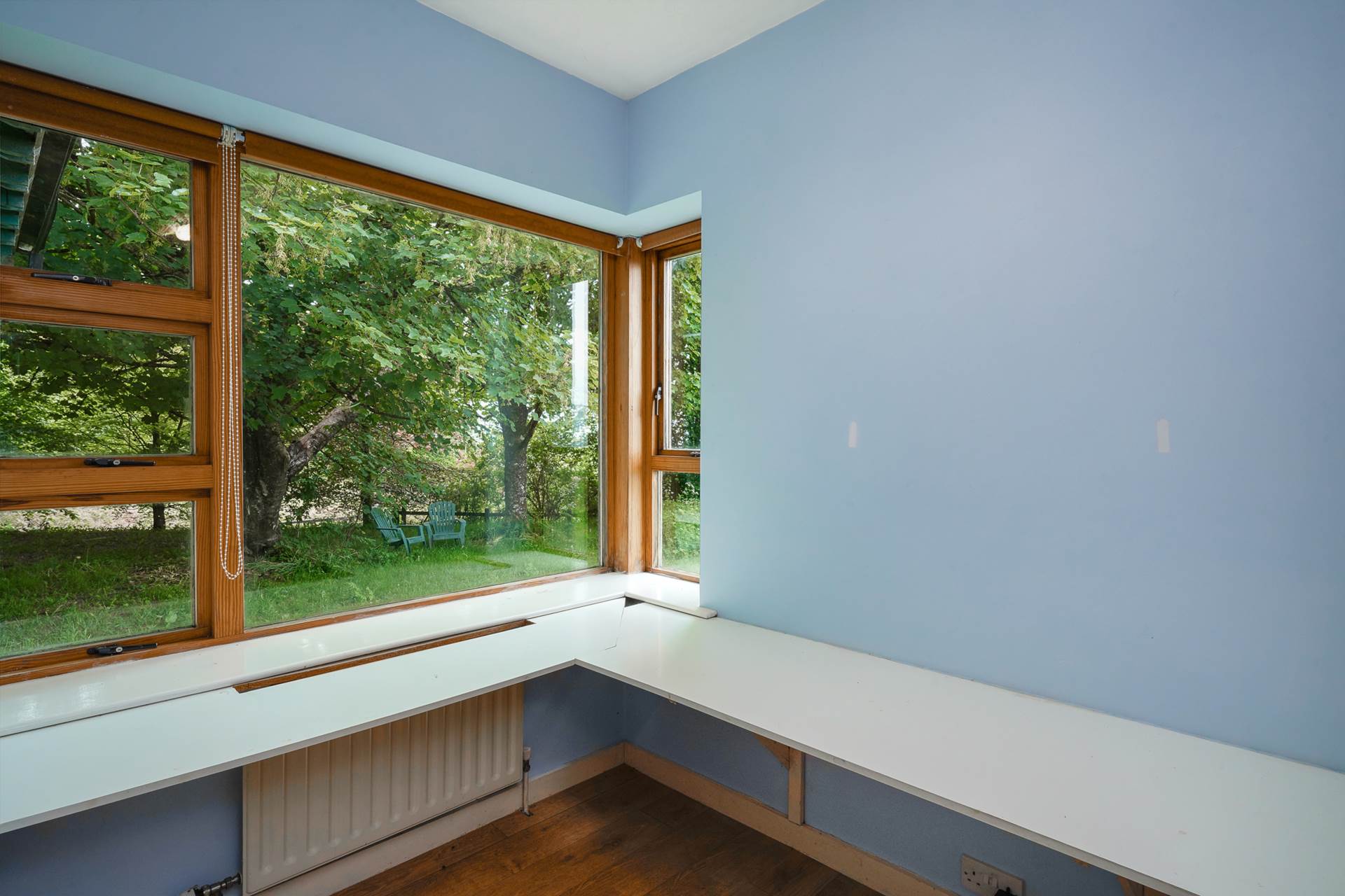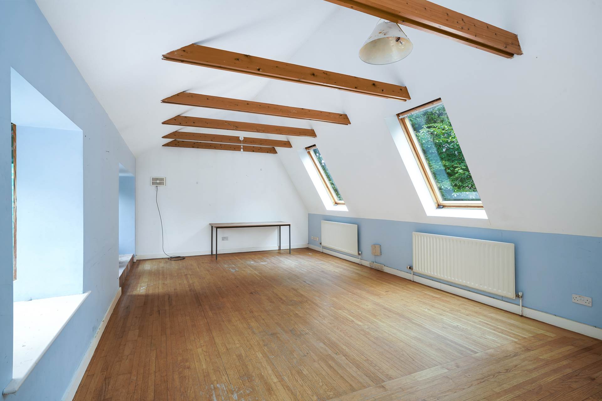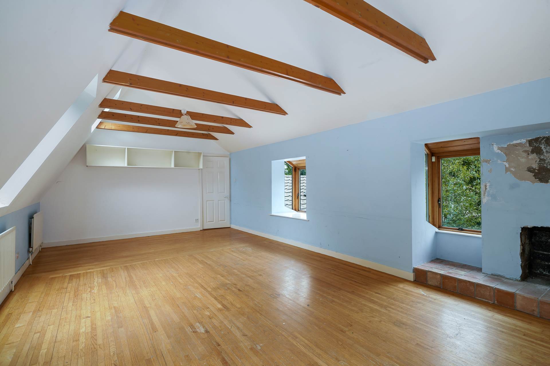 Upstairs there are two enormous rooms. The main bedroom has an ensuite, two velux windows and a corner window with the best view in the house. The other room was designed as a bright artists studio with an open fireplace, three windows, three further velux windows and exposed beams. It has a wooden floor and could be used as a ballet studio, lounge, or whatever you choose.