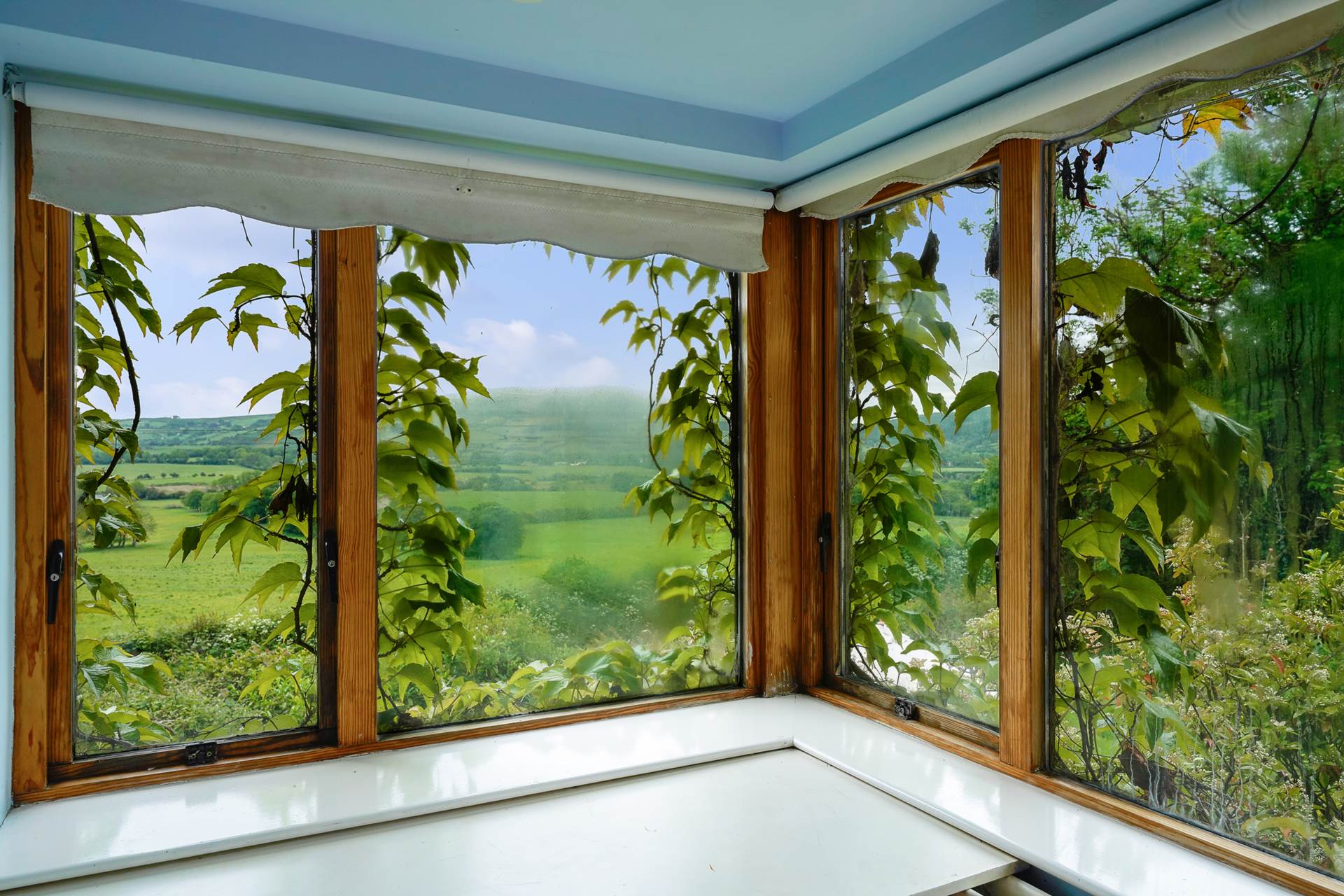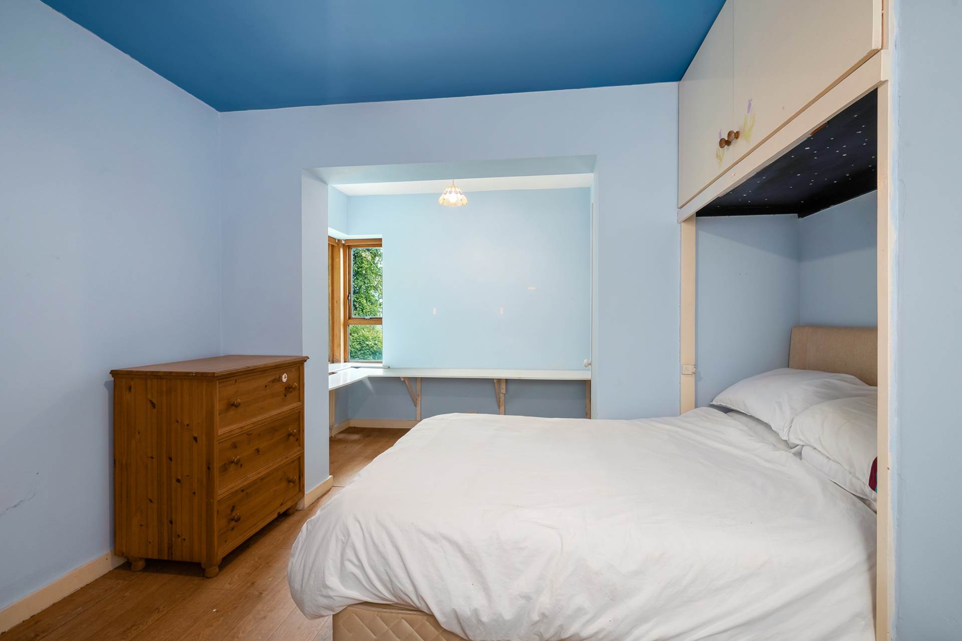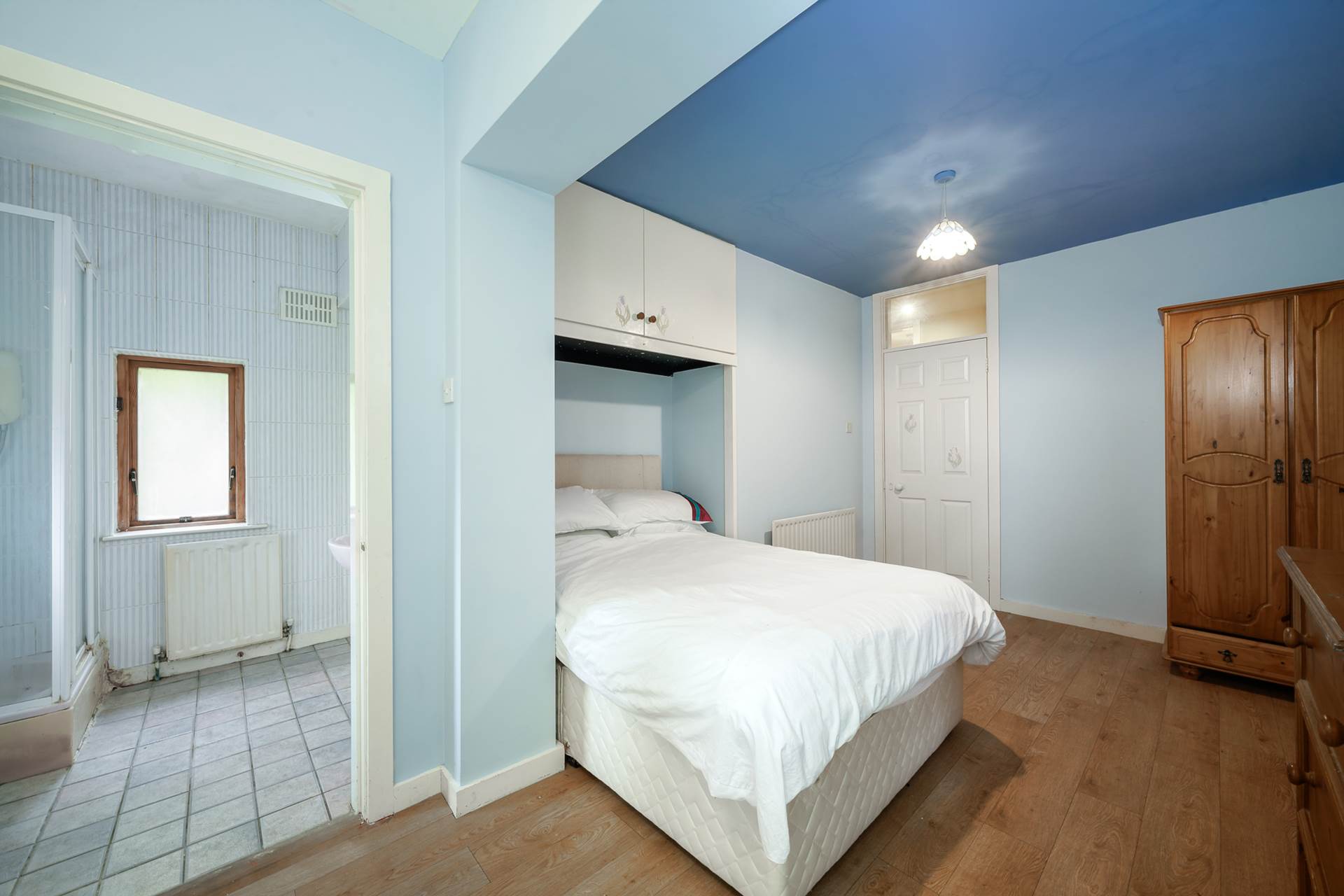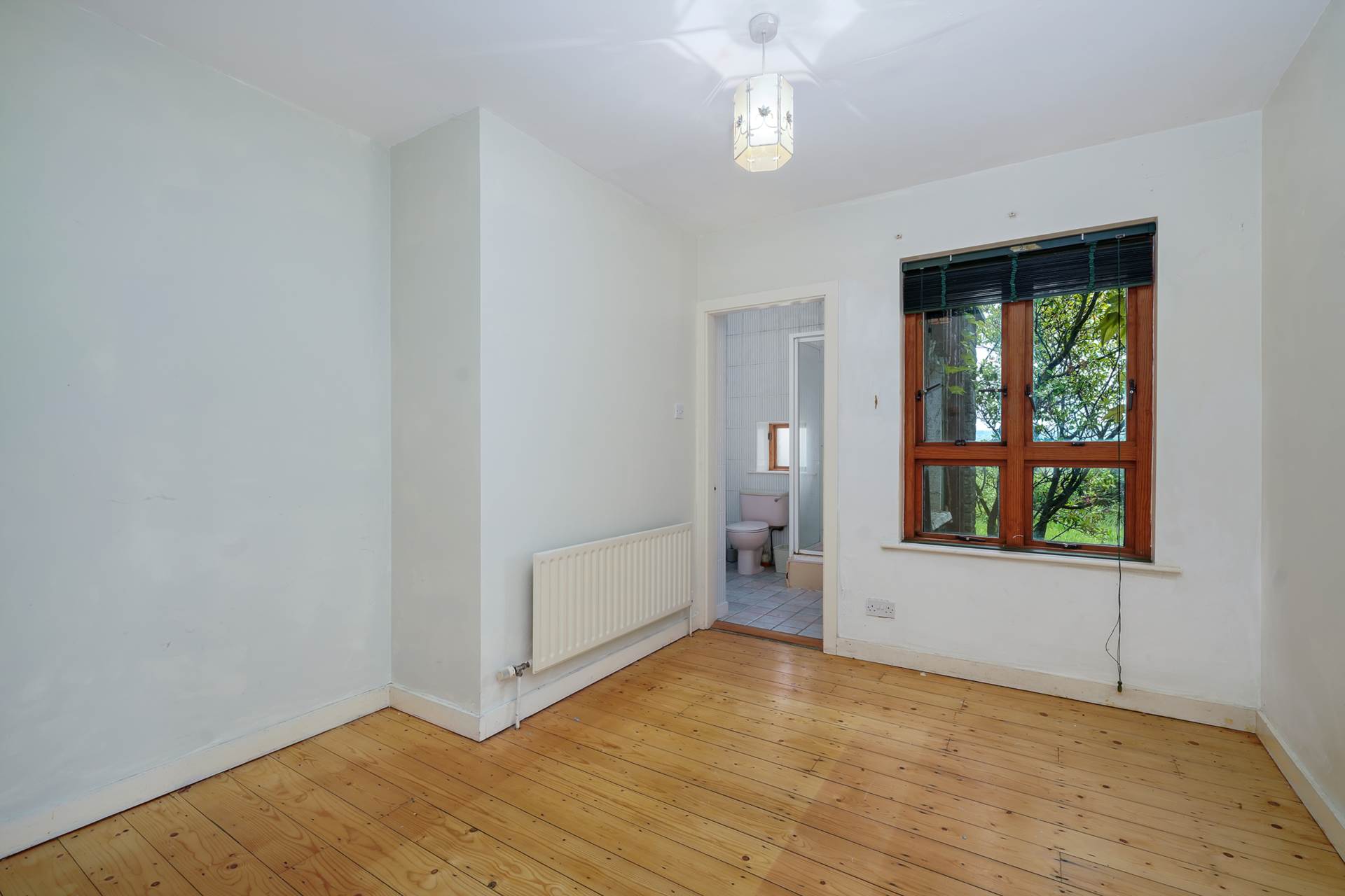 Upstairs there are two enormous rooms. The main bedroom has an ensuite, two velux windows and a corner window with the best view in the house. The other room was designed as a bright artists studio with an open fireplace, three windows, three further velux windows and exposed beams. It has a wooden floor and could be used as a ballet studio, lounge, or whatever you choose.